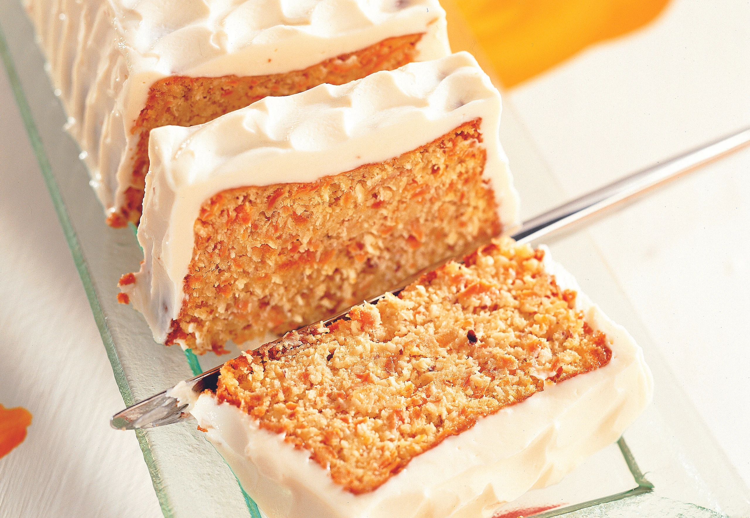 Frischkäse mit Zucker glatt rühren. Kuchen damit rundum einstreichen.