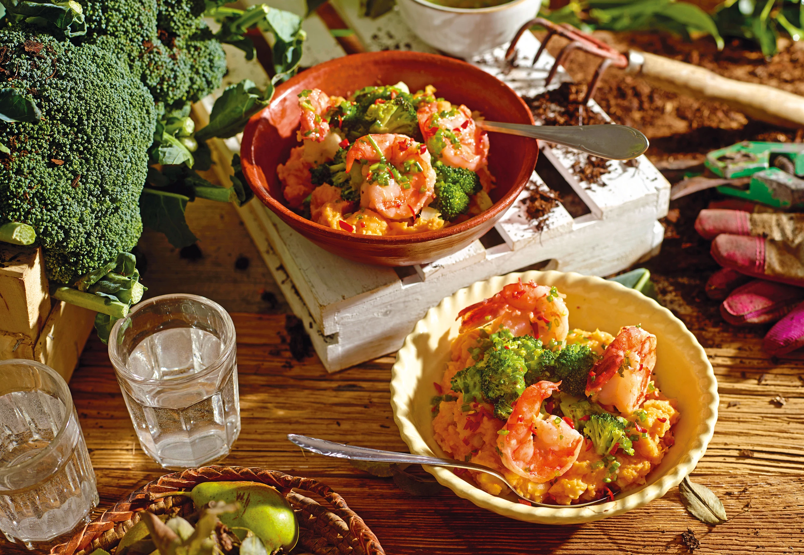 Süßkartoffel-Pastinakenbowl mit Brokkoli und scharfen Garnelen