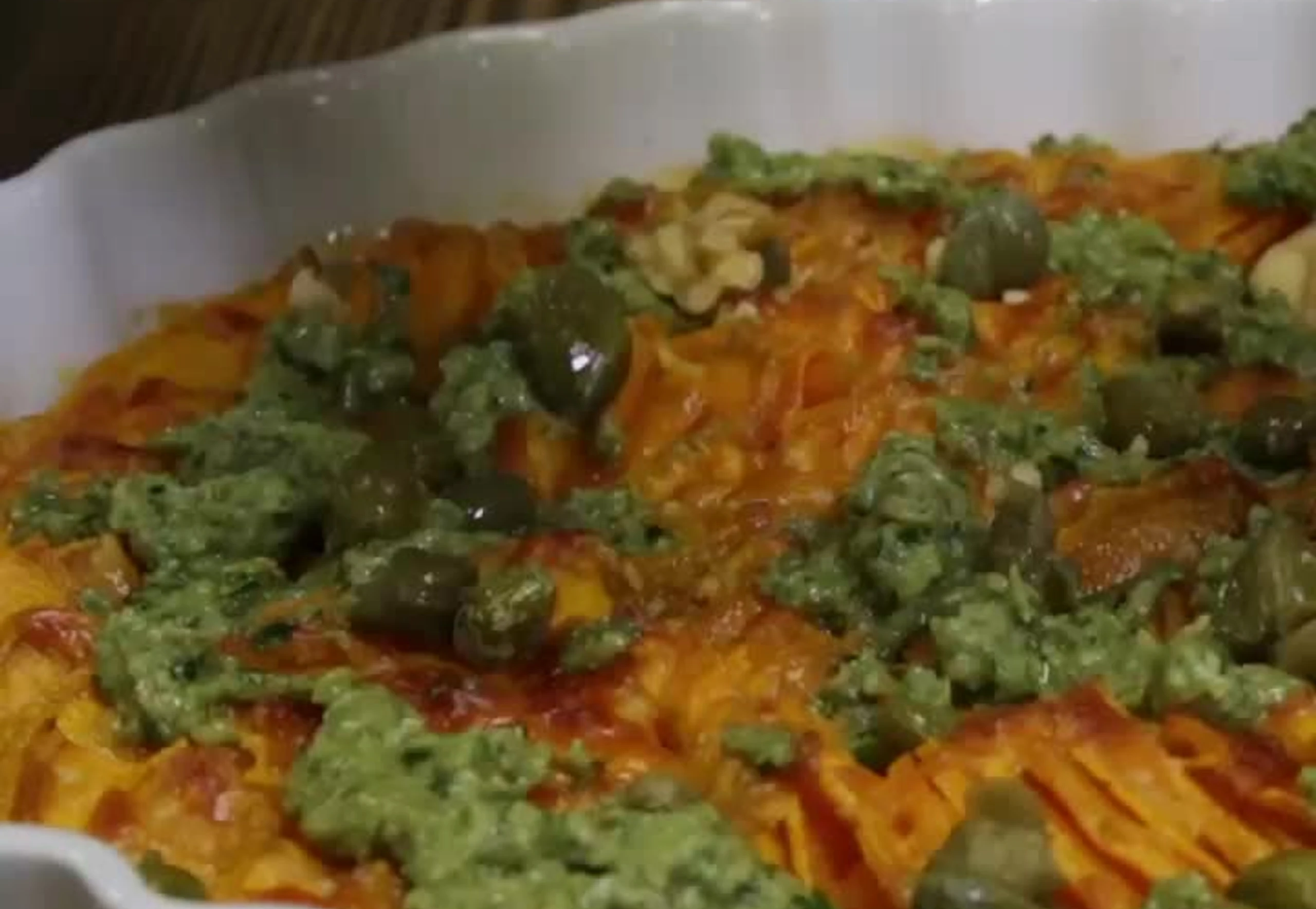 Gratin aus dem Rohr nehmen und noch heiß mit einigen Esslöffeln Walnuss-Kaperncreme beträufeln. Den Rest der Creme dazu reichen. Eventuell mit einigen Kapern und Walnüssen dekorieren.