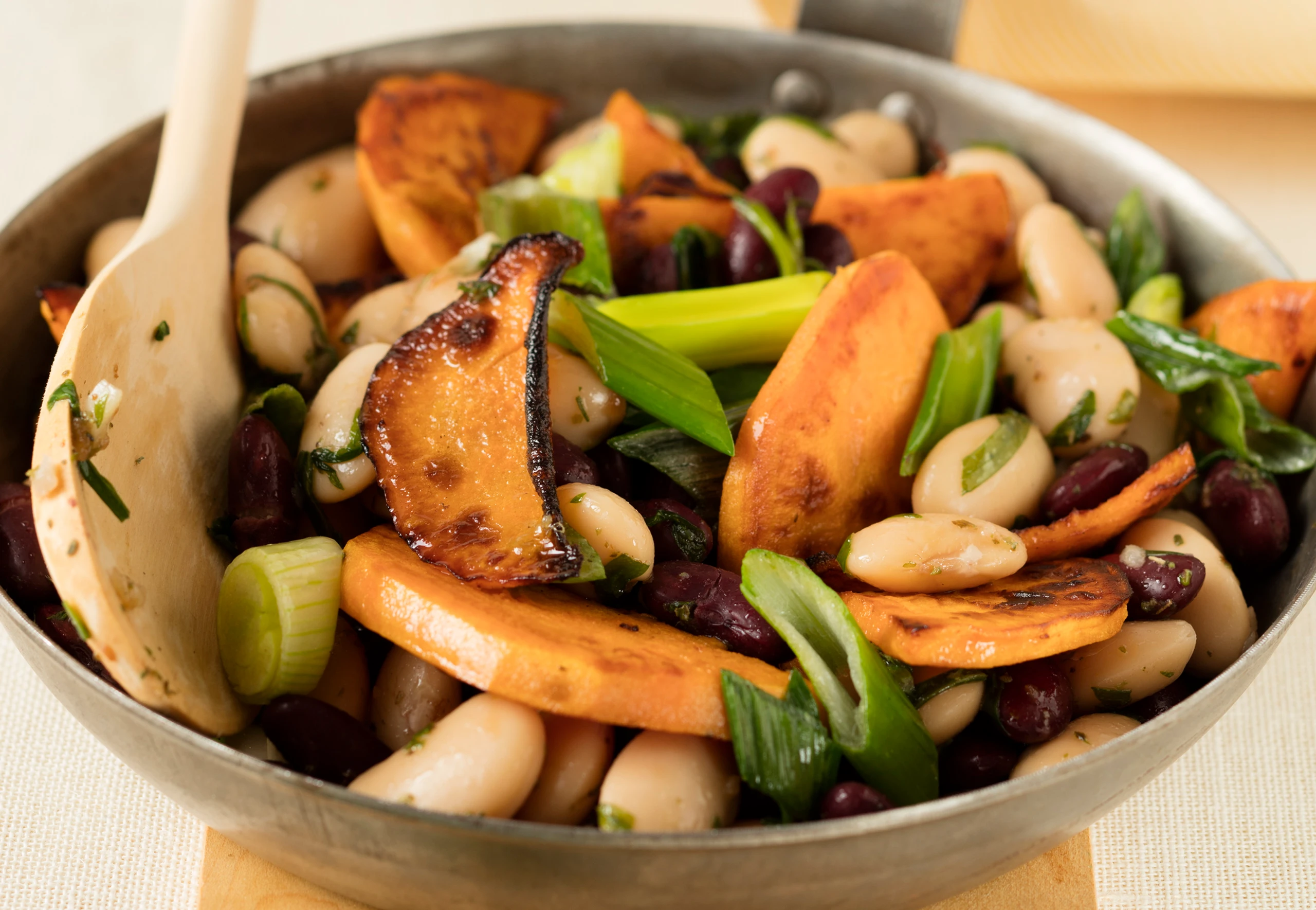 Weiße und rote Bohnen in ein Sieb leeren, kalt abspülen und abtropfen lassen. Jungzwiebeln putzen und quer in ca. 1 cm breite Stücke schneiden. Estragonblätter von den Stielen zupfen und hacken. Süßkartoffel schälen, in 1 cm dicke Scheiben schneiden.