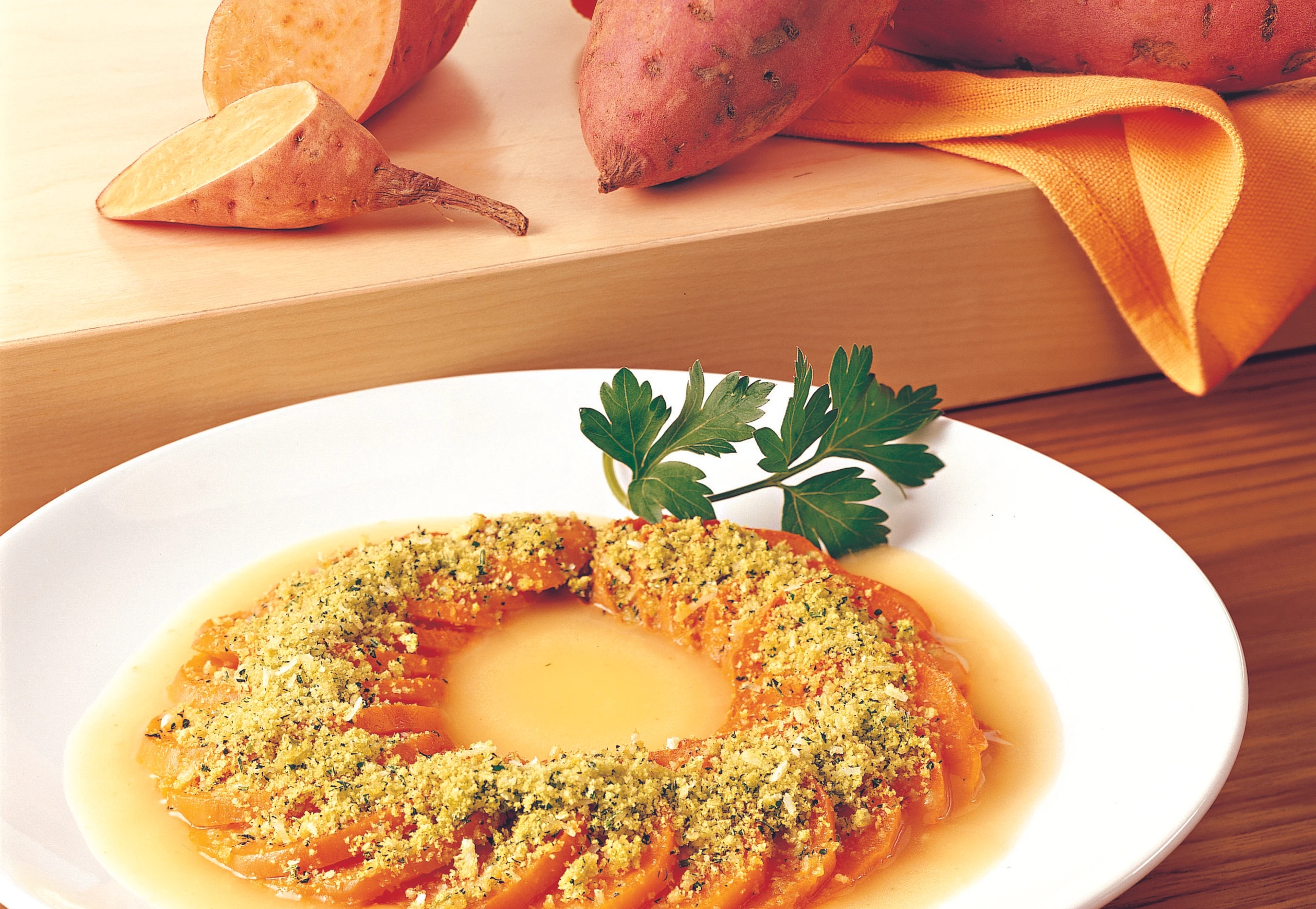 Süßkartoffeln mit einer Palette vorsichtig herausheben und auf vorgewärmten Tellern anrichten. Den heißen Fond mit einem Schneebesen glatt rühren, eventuell nachwürzen und über den Süßkartoffeln verteilen. Kräuterbrösel darüber streuen.