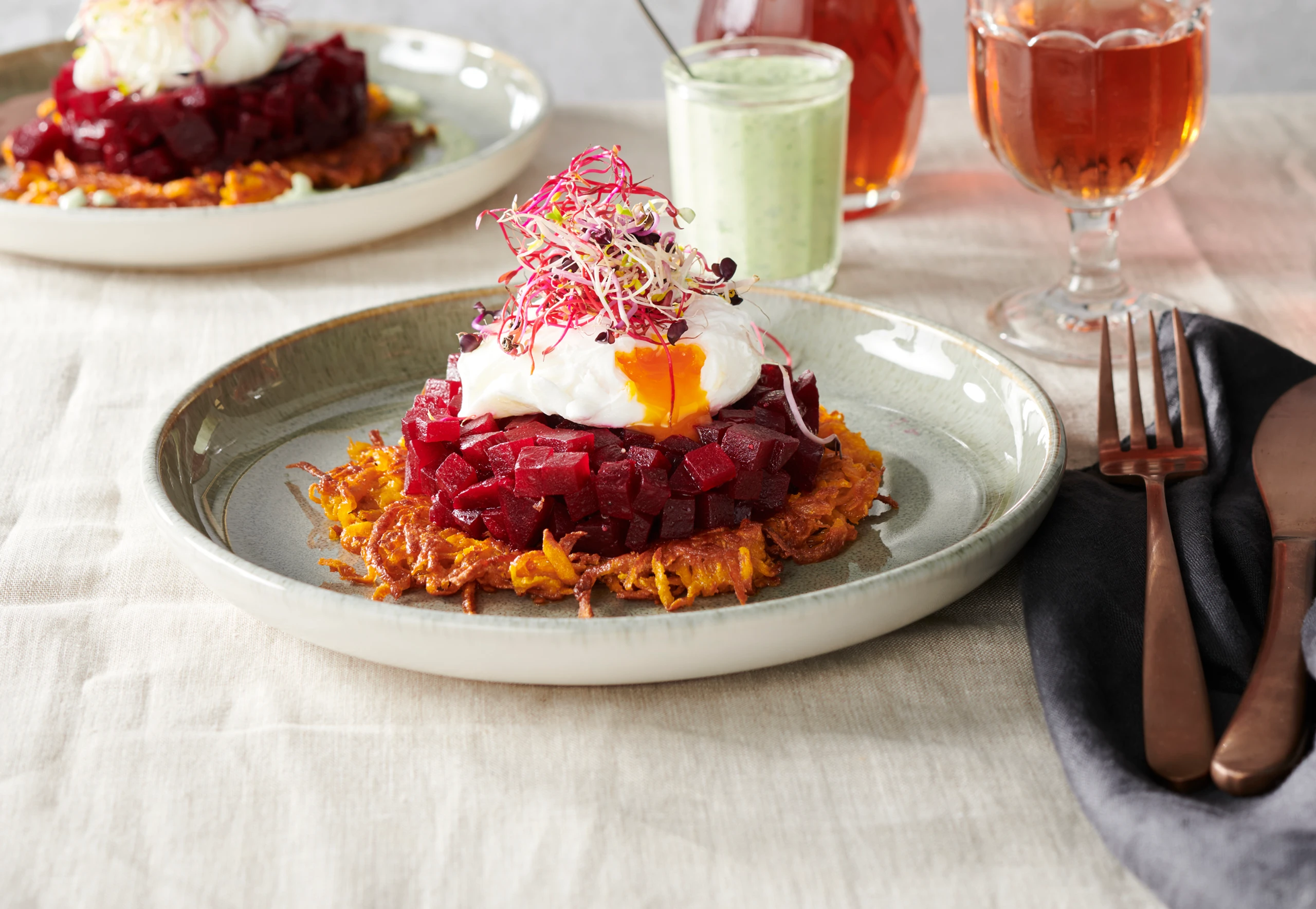 Süßkartoffelpuffer mit Rote-Rüben-Salat und pochiertem Ei