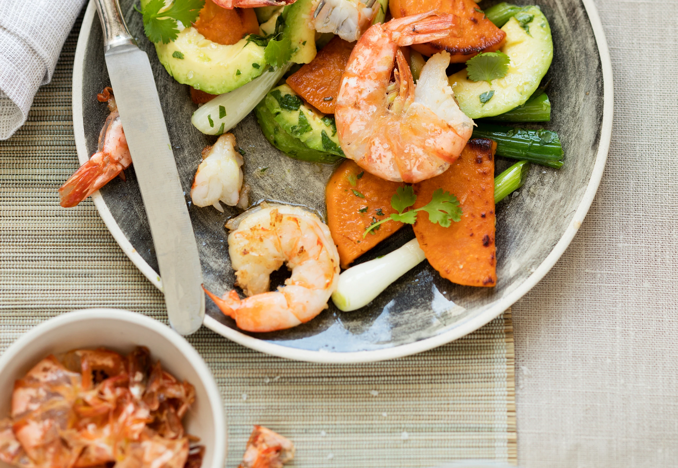 Garnelen in 3 EL Öl beidseitig braten, herausnehmen und beiseite stellen. Im Bratrückstand Süßkartoffelscheiben beidseitig braten, gegen Ende der Garzeit Jungzwiebeln untermischen und mitbraten. Gemüse mit der Marinade vermischen und mit den Garnelen anrichten.