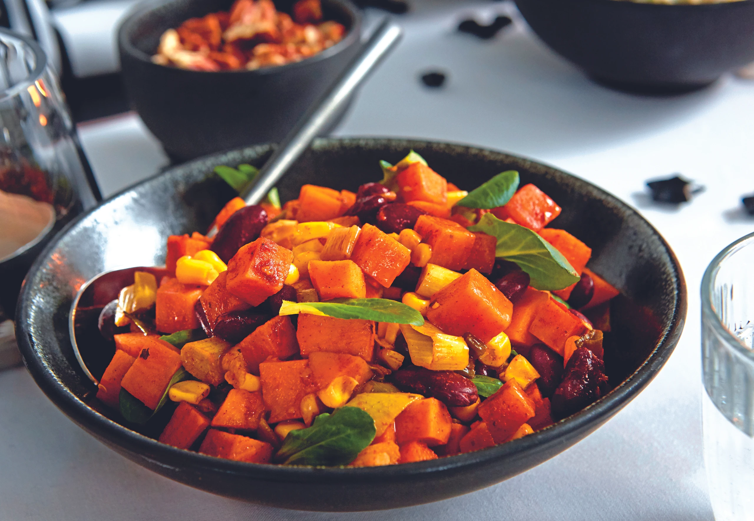 Süßkartoffelsalat mit Mais, Bohnen und Vogerlsalat