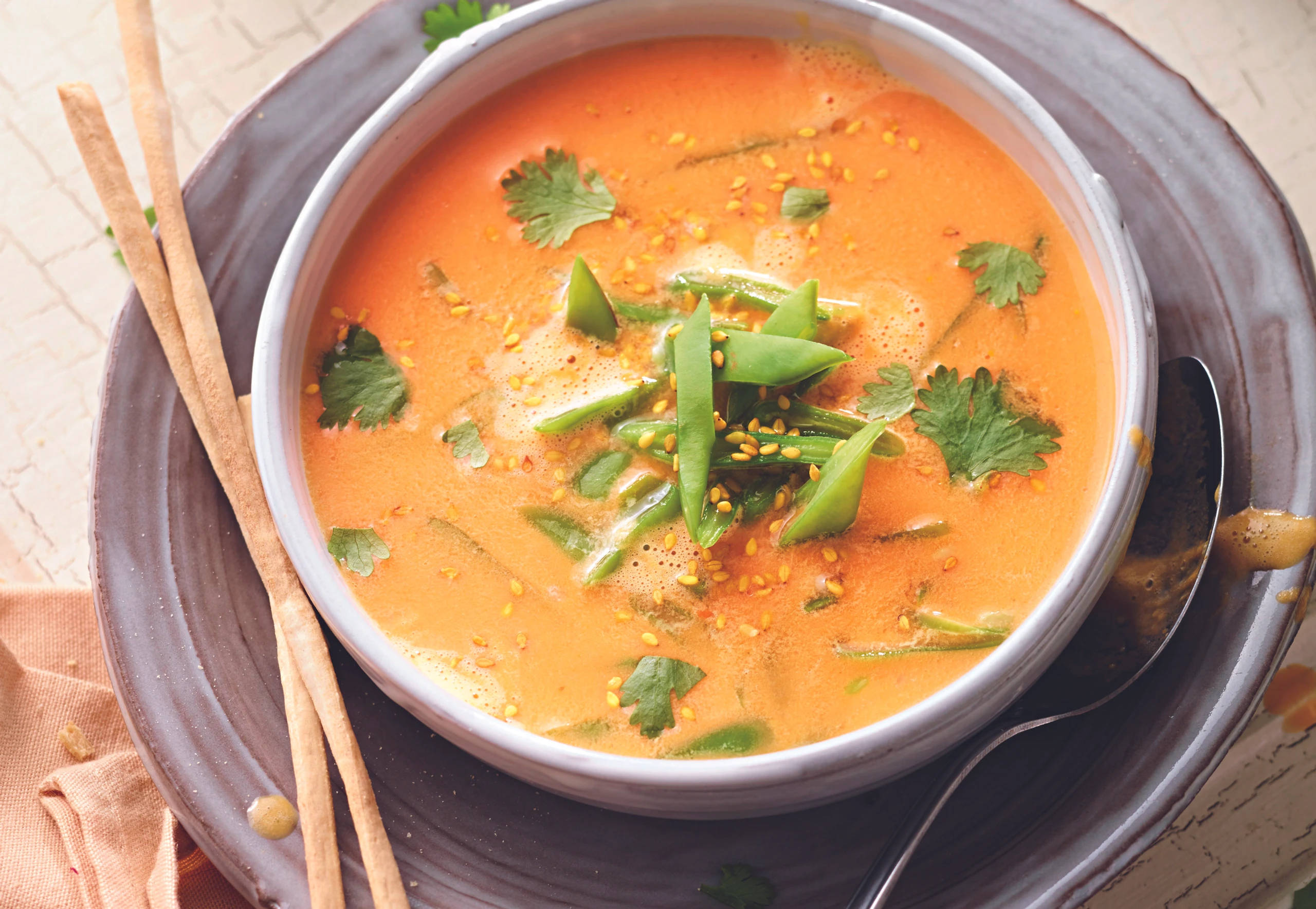 Kokosmilch in die Suppe gießen, aufkochen und mit Salz, Pfeffer, Ingwer und Limettensaft würzen. Suppe pürieren, mit Fisolenstreifen, Koriander und Sesam garniert servieren.