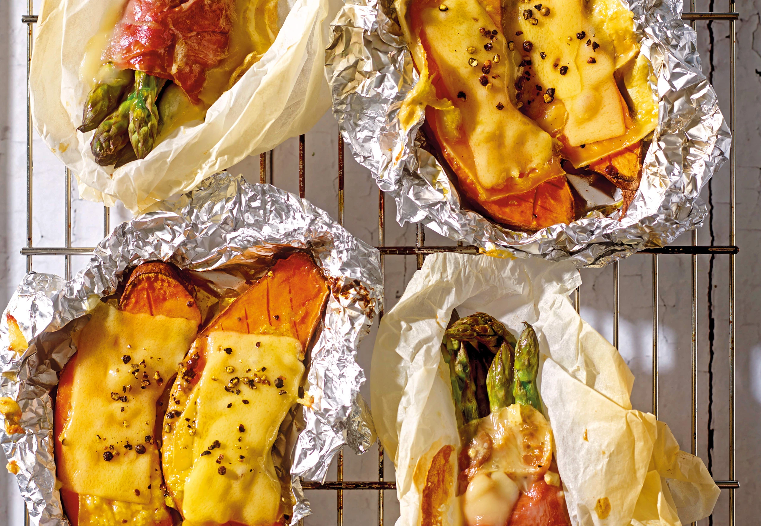 4 Quadrate (je ca. 30 x 30 cm) aus Alufolie zuschneiden. Süßkartoffeln paarweise mit den Schnittflächen nach oben daraufsetzen, mit der Knoblauchbutter übergießen. Mit Salz und Thymian würzen und mit Käse belegen. Folie über den Süßkartoffeln schließen. Päckchen auf ein Backblech setzen und im Rohr (mittlere Schiene) ca. 45 Minuten backen.