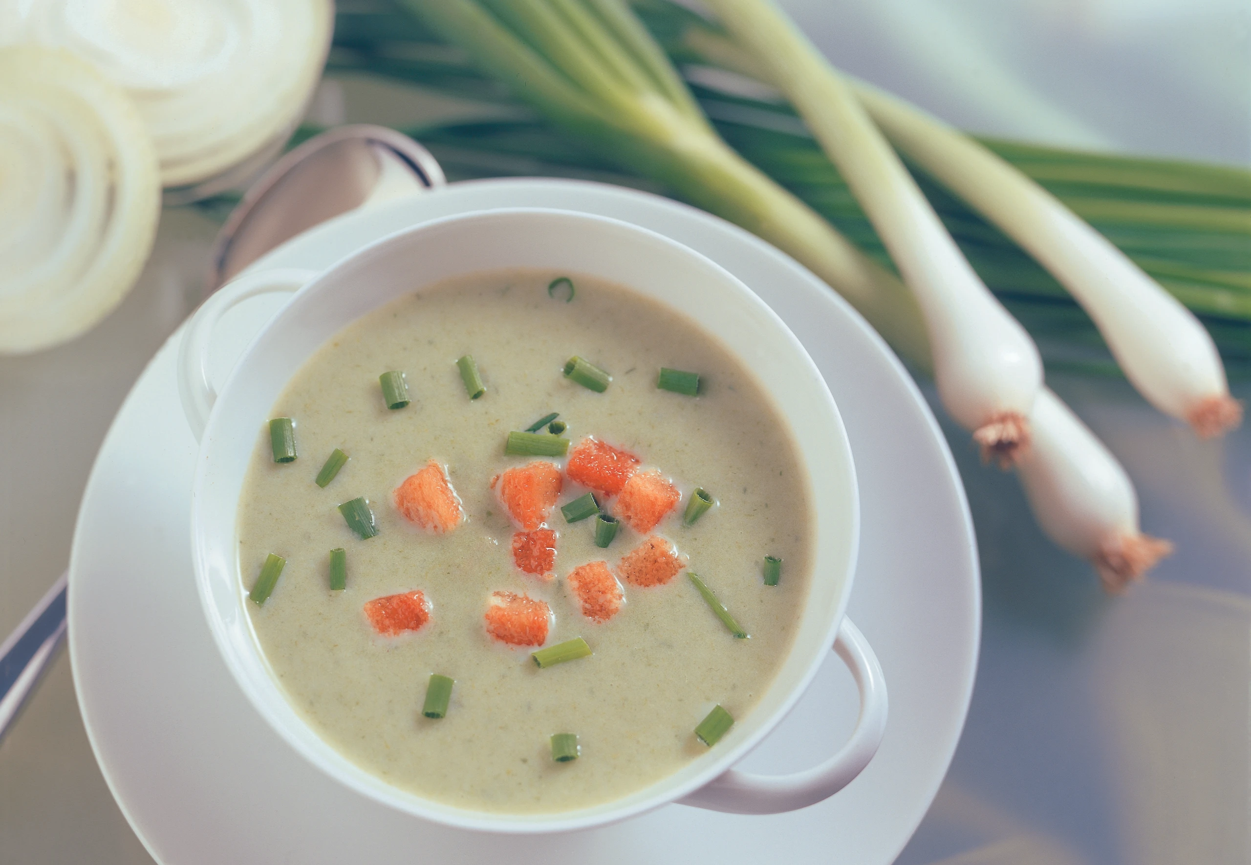 Jungzwiebeln und Zwiebel in 20 g von der Butter hell anschwitzen, mit Suppe und Milch aufgießen und aufkochen. Erdäpfel zugeben und die Suppe bei mittlerer Hitze ca. 30 Minuten köcheln – dabei öfters umrühren.