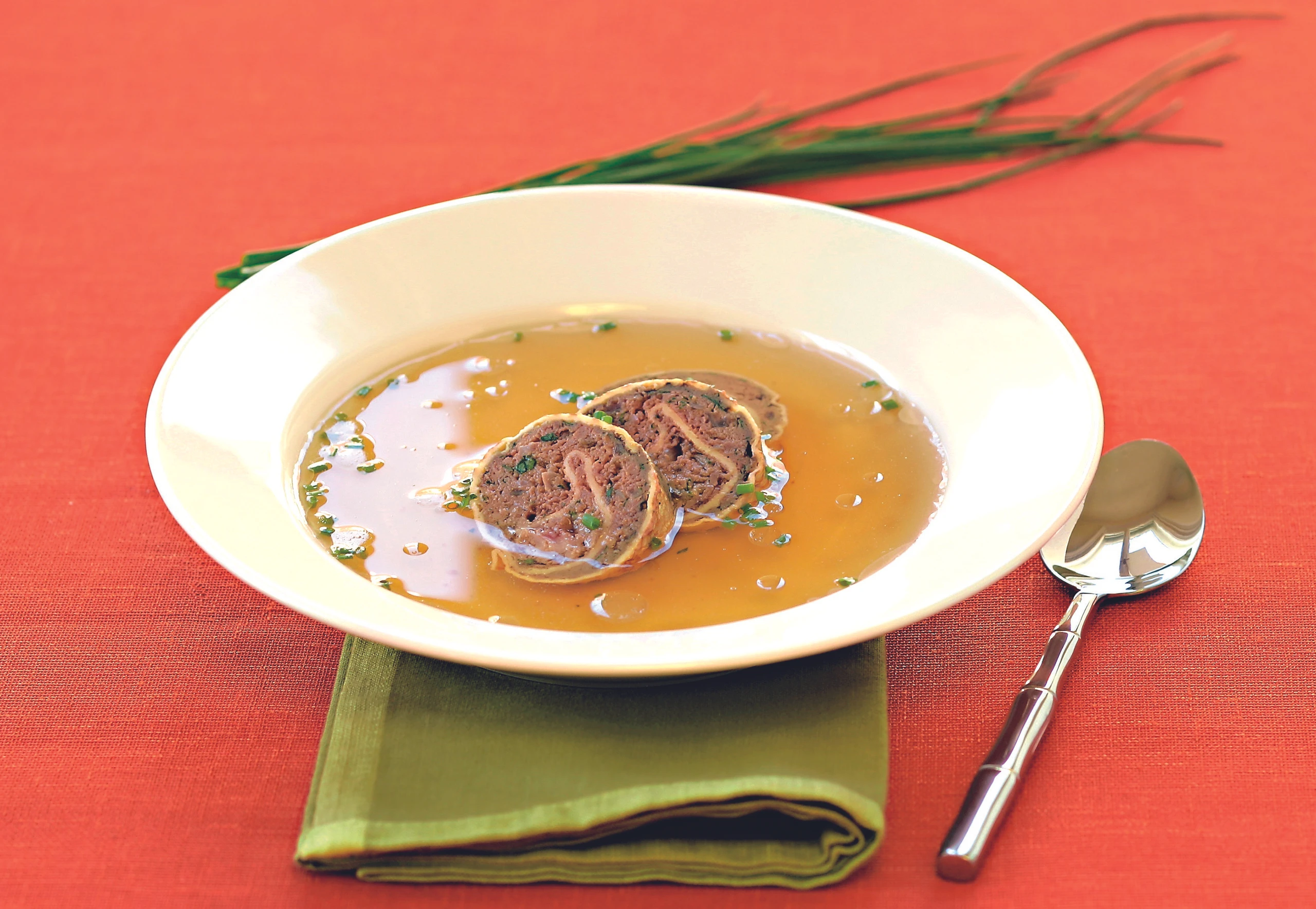 - Rollen auswickeln und in Scheiben schneiden. In die Suppe legen und mit Schnittlauch bestreut servieren.