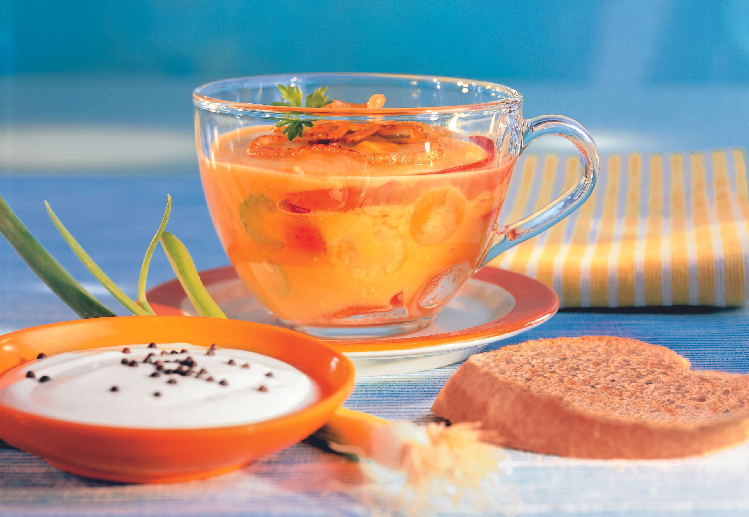 Suppe mit Suppenwürfel, Liebstöckel, Chili, Zitronenschale und -saft würzen. Karotte, Sellerie, Paprika und Lauch zugeben. Suppe zugedeckt köcheln, bis das Gemüse bissfest ist. Abschmecken, mit Zwiebelringen und Petersilie bestreuen mit Joghurt-Raita servieren. Dazu passt Vollkornbrot.