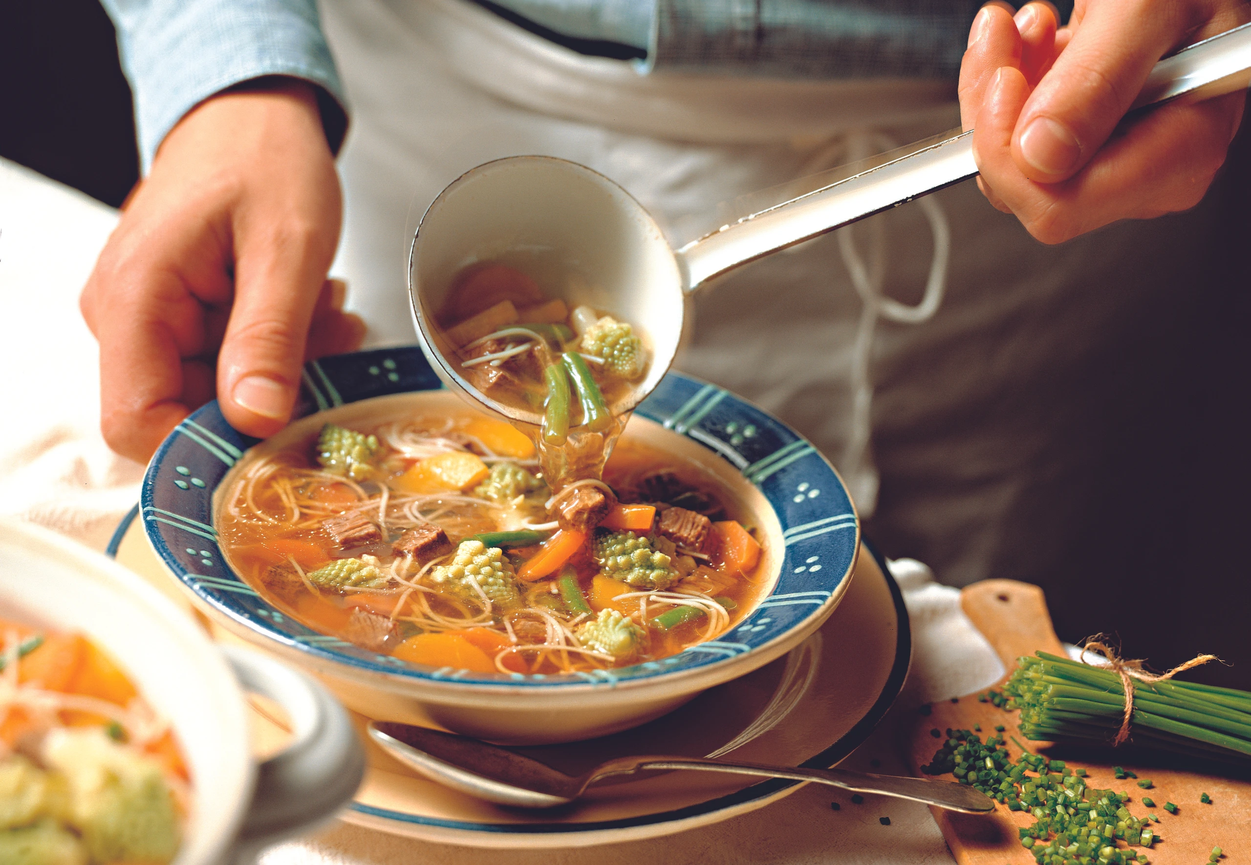 - Karotten, Gelbe Rüben und Fisolen zugeben und die Suppe weitere 15 Minuten köcheln.