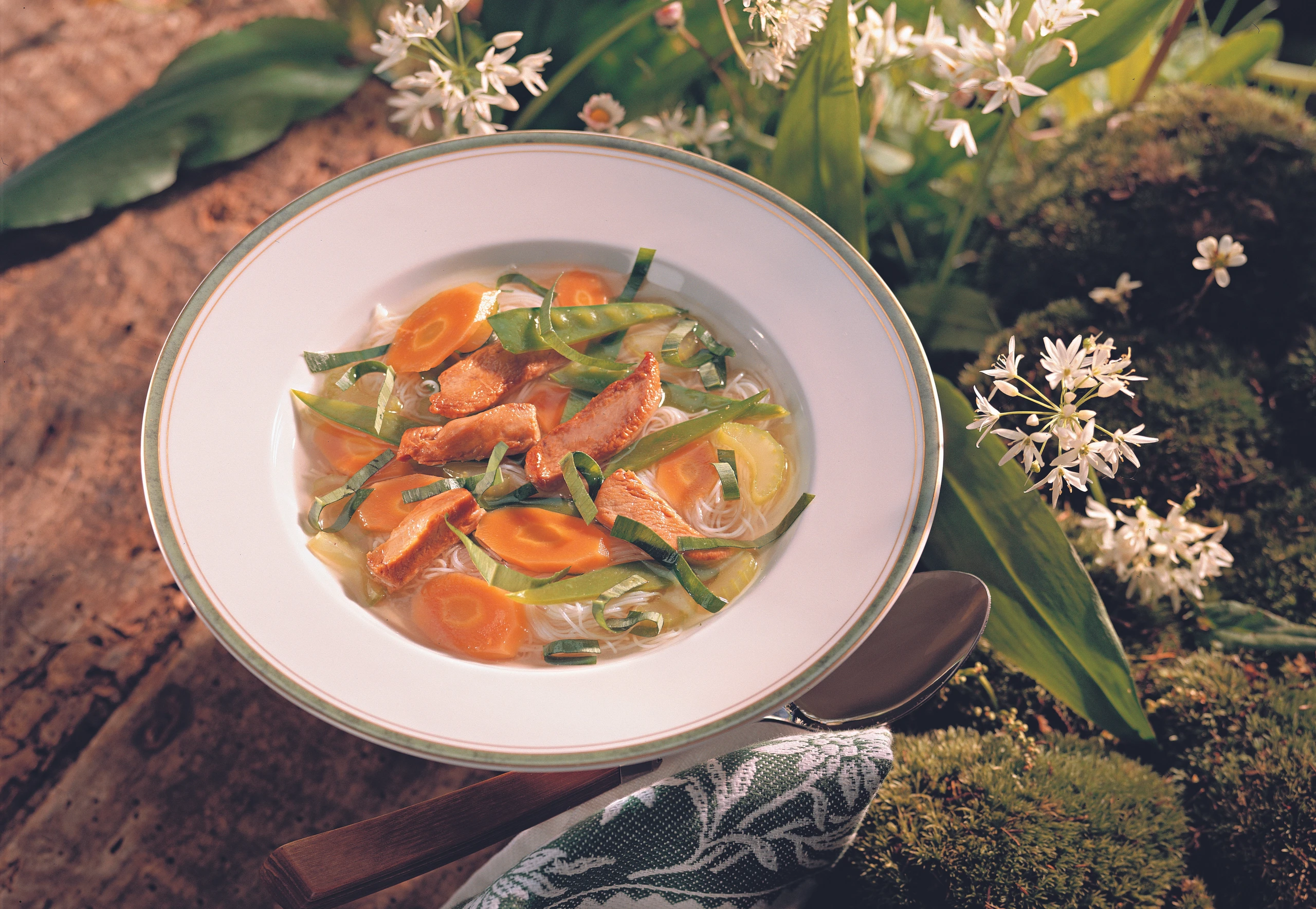 Suppe ca. 3 Minuten kochen, Erbsenschoten zugeben und 1 Minute kochen. Zuletzt die Glasnudeln einrühren und die Suppe noch 2 Minuten kochen. Bärlauch untermischen, die Suppe mit Sherry und Pfeffer würzen und anrichten.