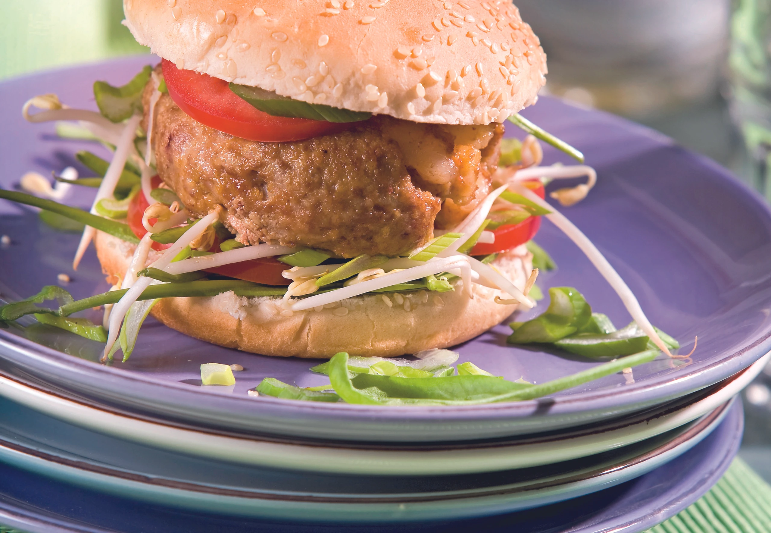 Aus der Masse 4 Laibchen formen. In einer Pfanne wenig Sesamöl erhitzen, Laibchen darin bei mäßiger Hitze beidseitig braten. Burger mit je 1 gebratenen Laibchen belegen, mit dem Burger-Deckel abschließen.