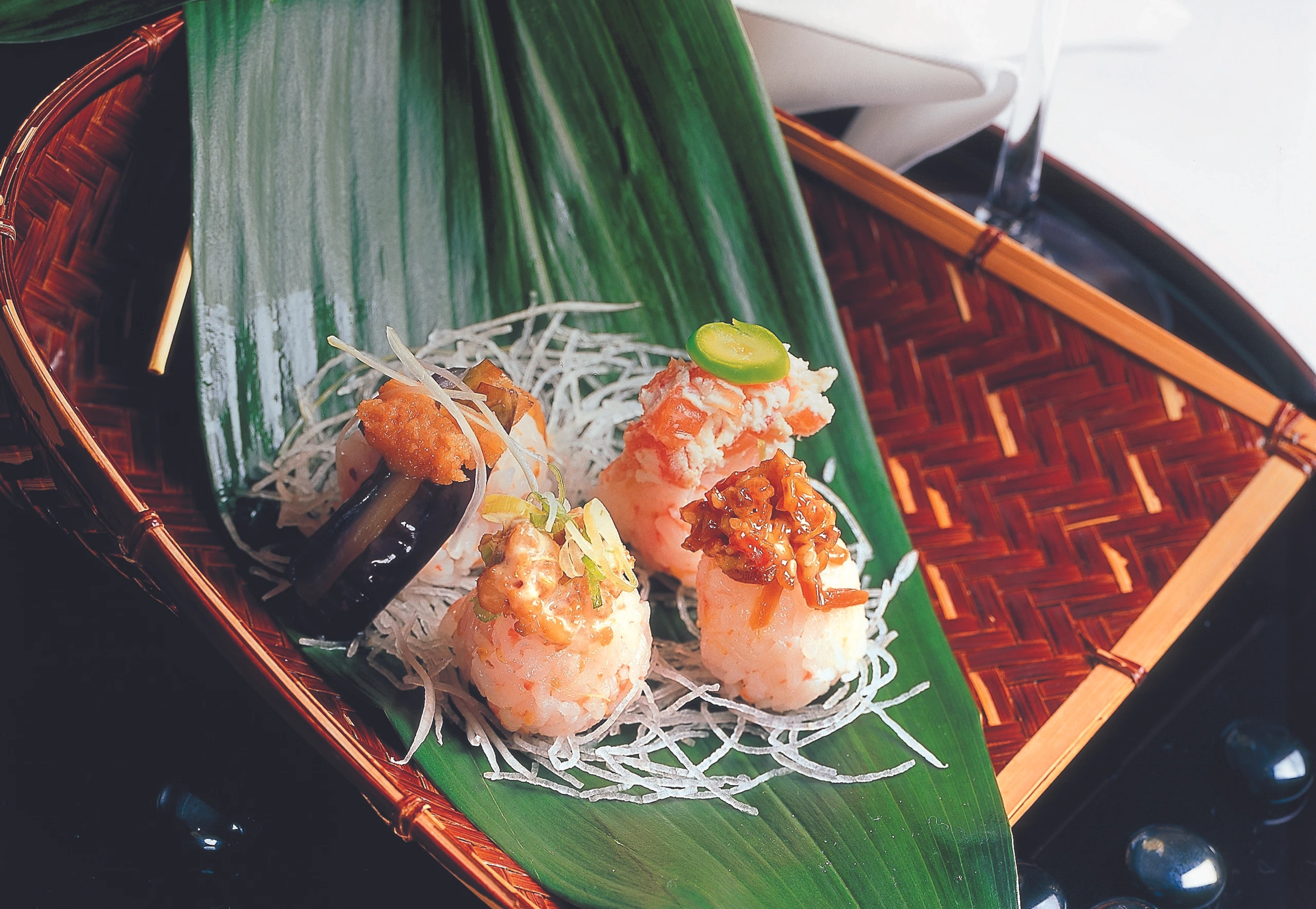- Melanzani abtropfen lassen. Reiskugeln damit belegen und mit Kaviar garnieren.