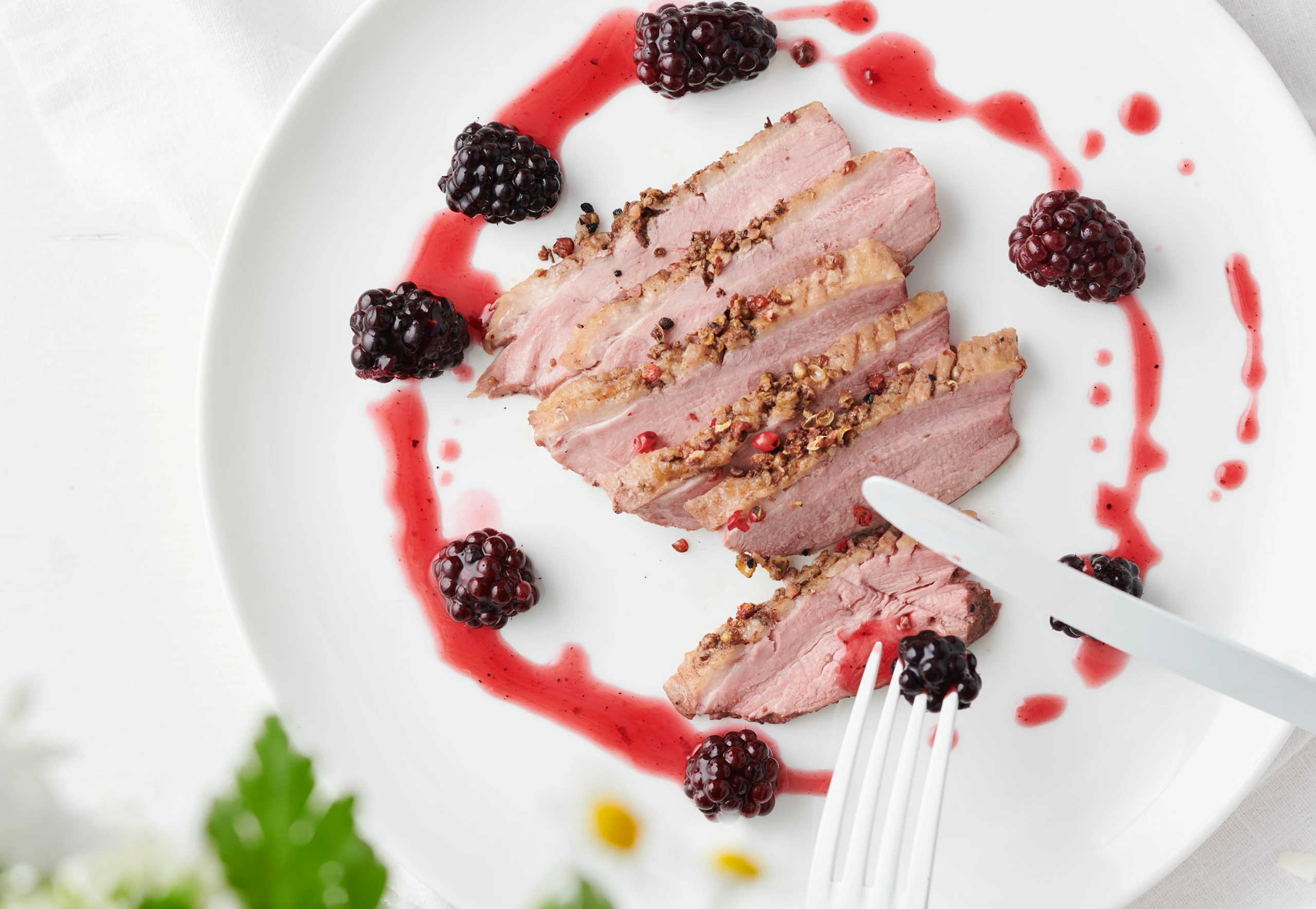 Für die Sauce Schalotte schälen, klein würfeln und in der Butter anschwitzen, bis sie leicht bräunt. Wein zugießen und einreduzieren lassen. Brombeermarmelade einrühren. Sauce vom Herd nehmen, Brombeeren zugeben und ziehen lassen. Entenbrüste aufschneiden und mit der Sauce servieren.