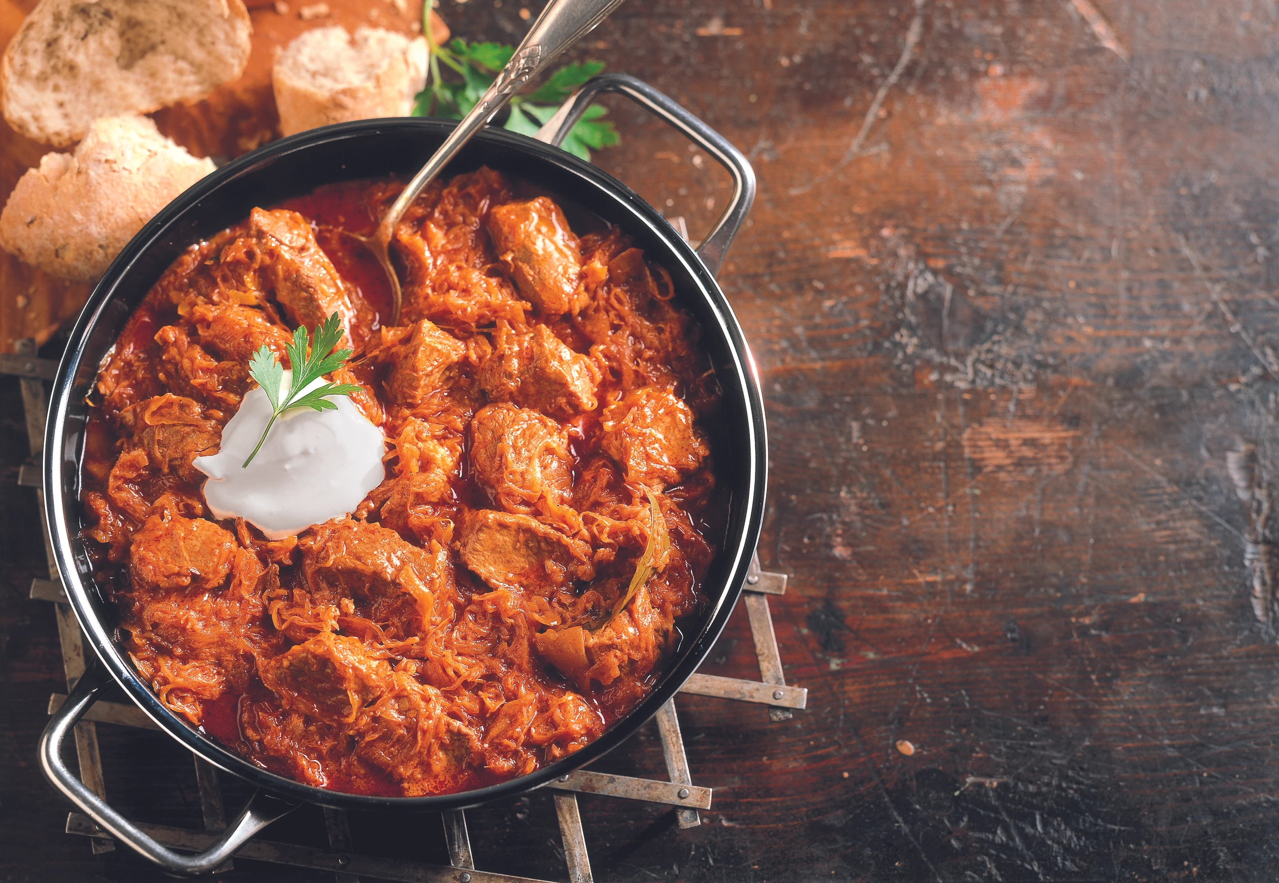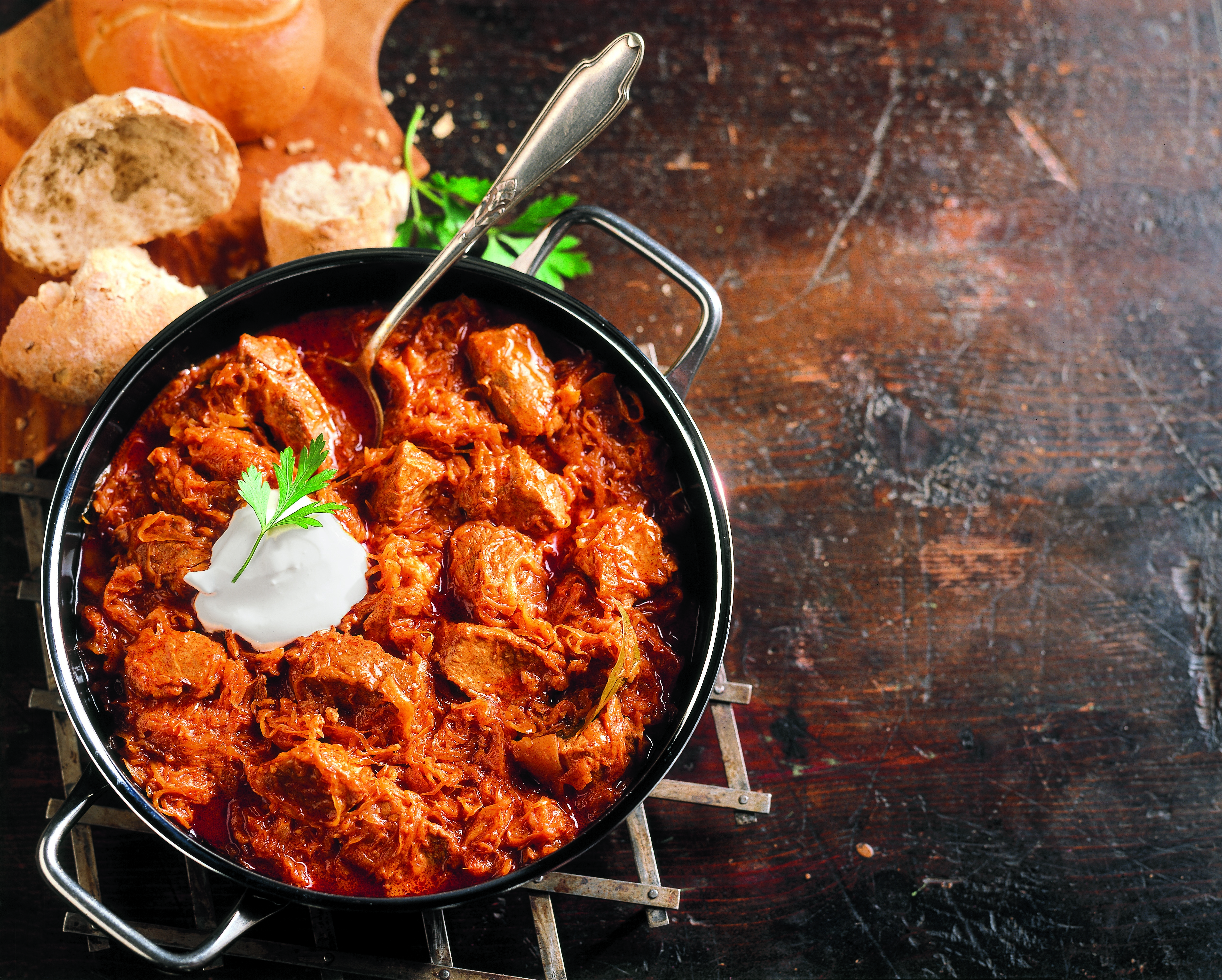 - Zwiebel in Öl unter öfterem Rühren goldgelb rösten. Hitze reduzieren, das Paprikapulver einrühren und anschwitzen. Wasser zugießen und aufkochen. Fleisch salzen, pfeffern, untermischen und bei mittlerer Hitze zugedeckt ca. 45 Minuten dünsten.