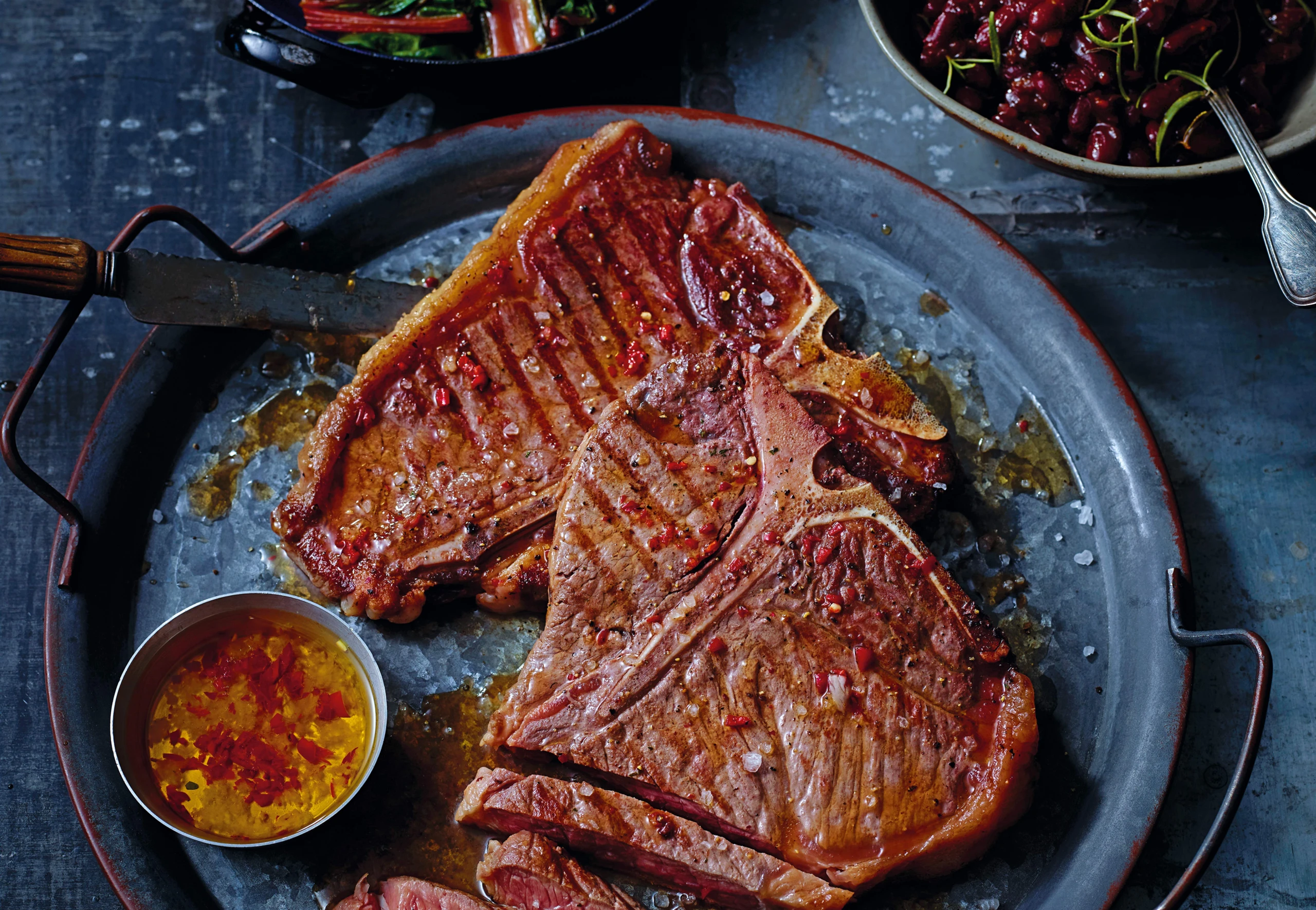 T-Bone-Steak mit Chili-Knoblauchöl, Mangold und Barbecue-Bohnen