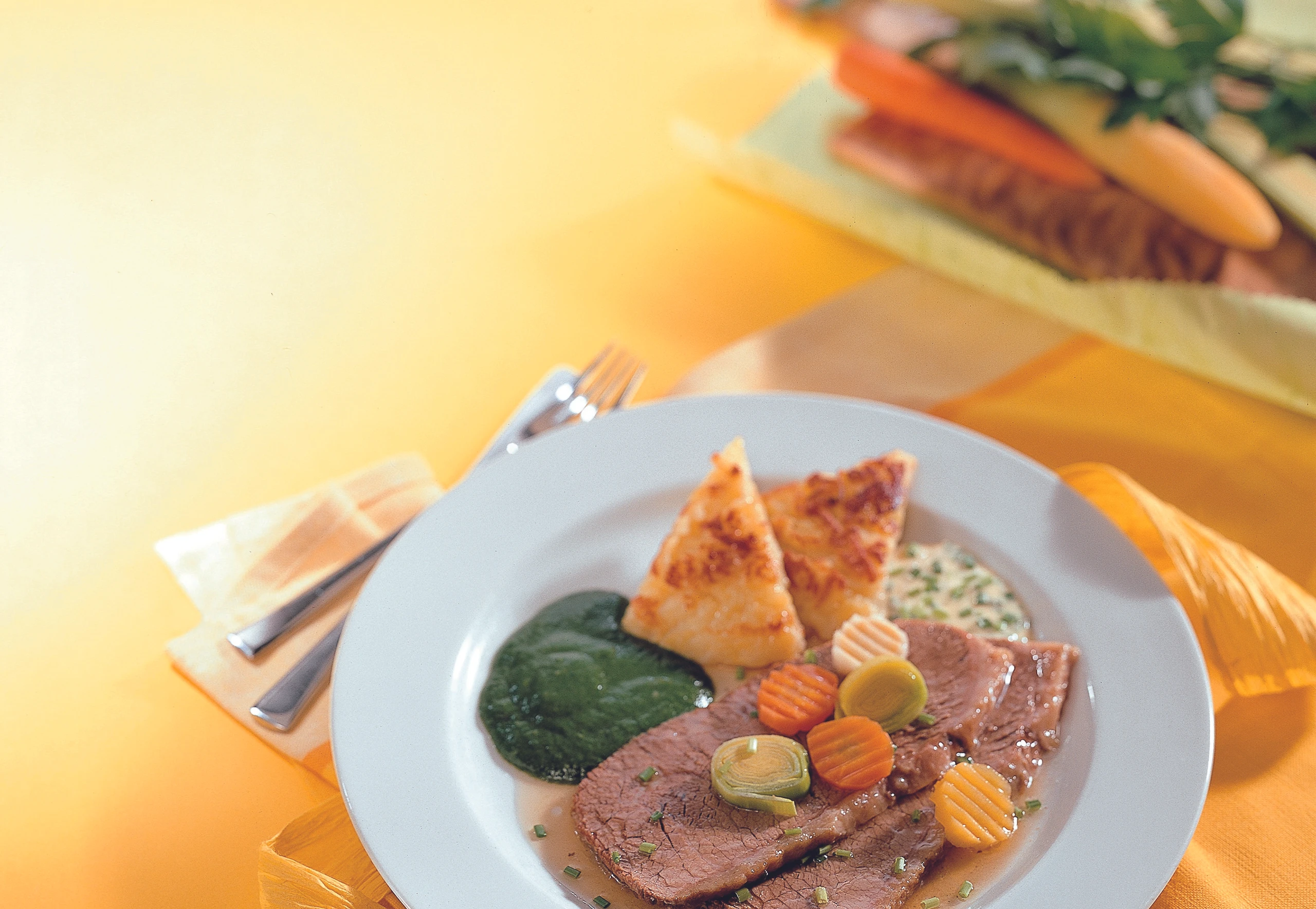 - Fleisch und Gemüse in fingerdicke Scheiben schneiden. Suppe abseihen und salzen. Fleisch und Gemüse mit ein wenig Suppe anrichten, mit Meersalz und Schnittlauch bestreuen und mit den Beilagen servieren.