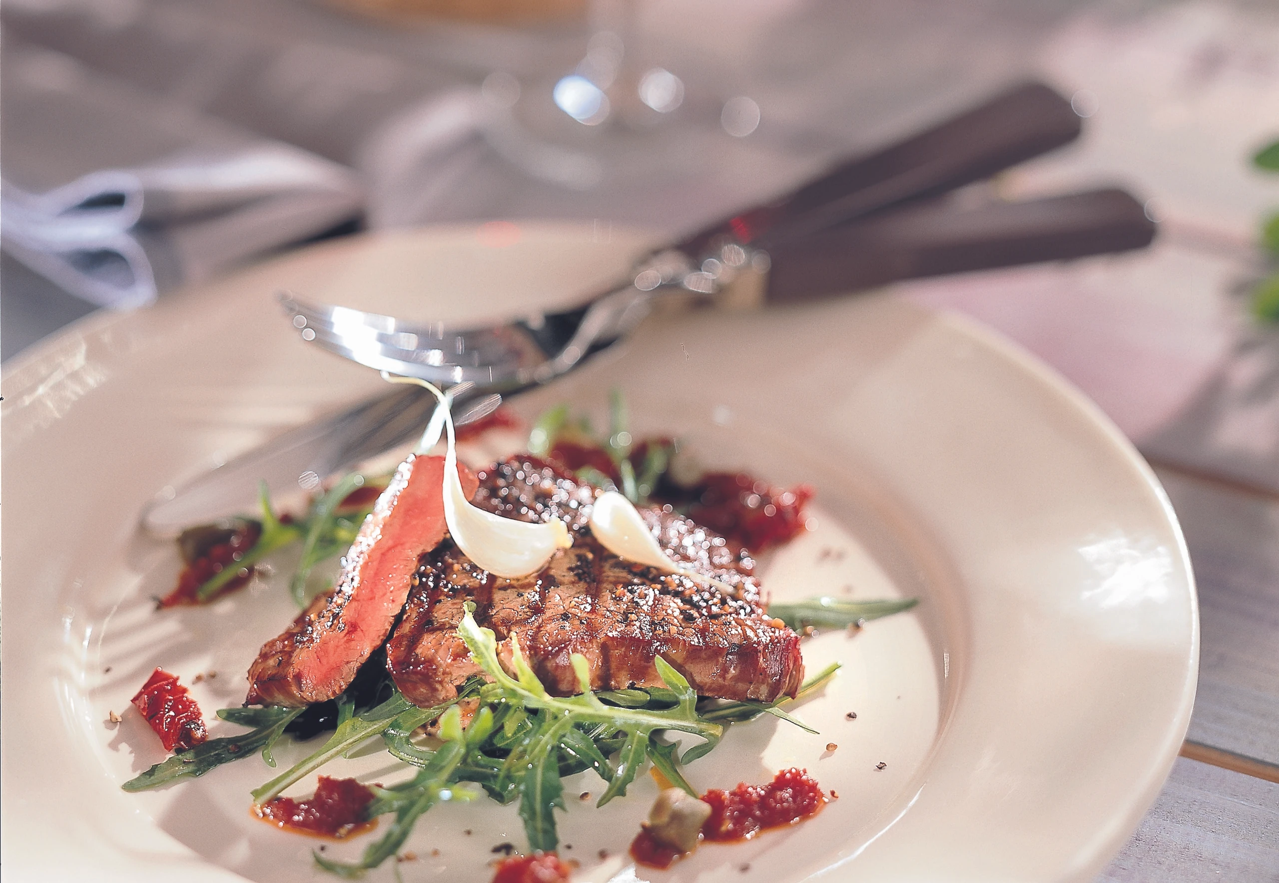 Rucola mit Salz, Pfeffer und Essig vermischen, mit Olivenöl beträufeln. Rucola kurz abtropfen lassen, auf Tellern anrichten, die Filetscheiben darauf anrichten. Mit rotem Pesto und eventuell mit in der Schale gebratenen, abgezogenen Knoblauchzehen dekorieren.