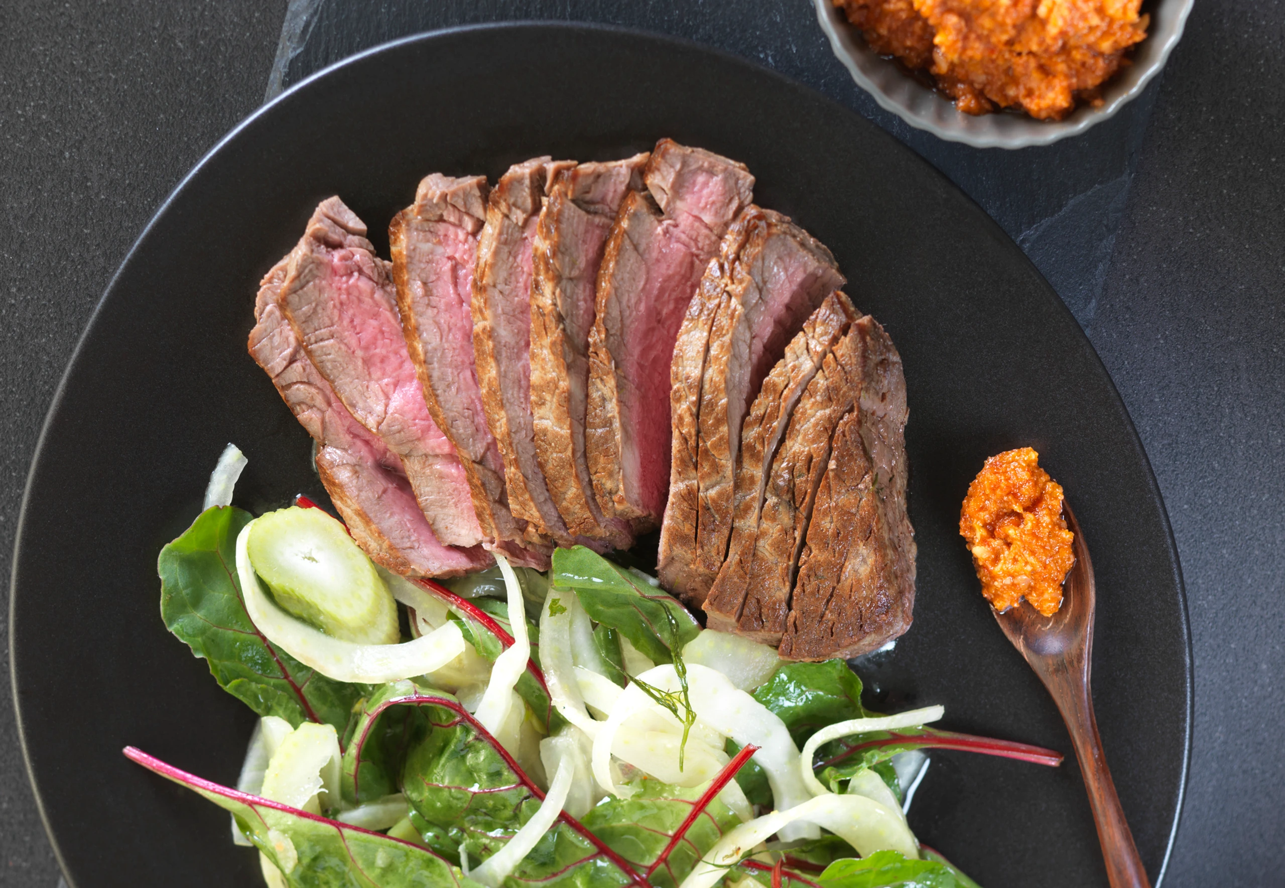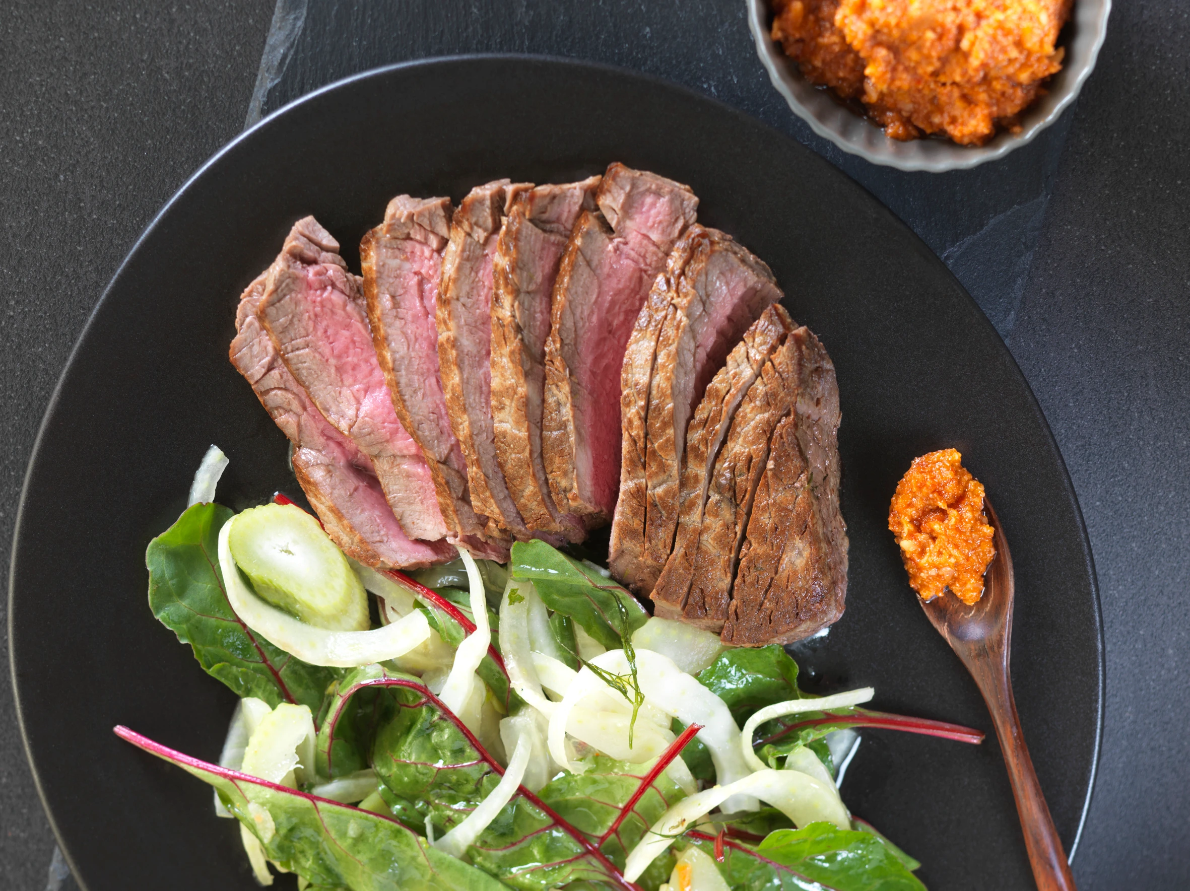 Tagliata vom Rind mit rotem Pesto und Fenchel-Mangoldsalat