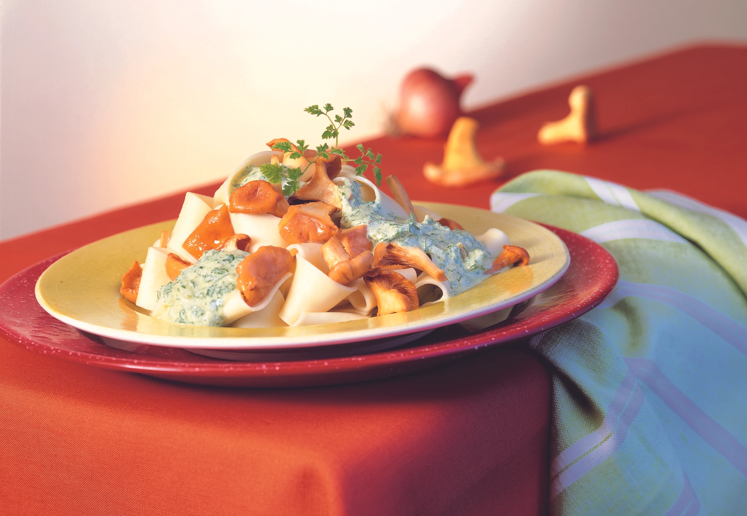 - Nudeln kurz abtropfen lassen, sofort auf Tellern anrichten, Schwammerln und Sauce darüber verteilen, mit Petersilblättchen dekorieren.