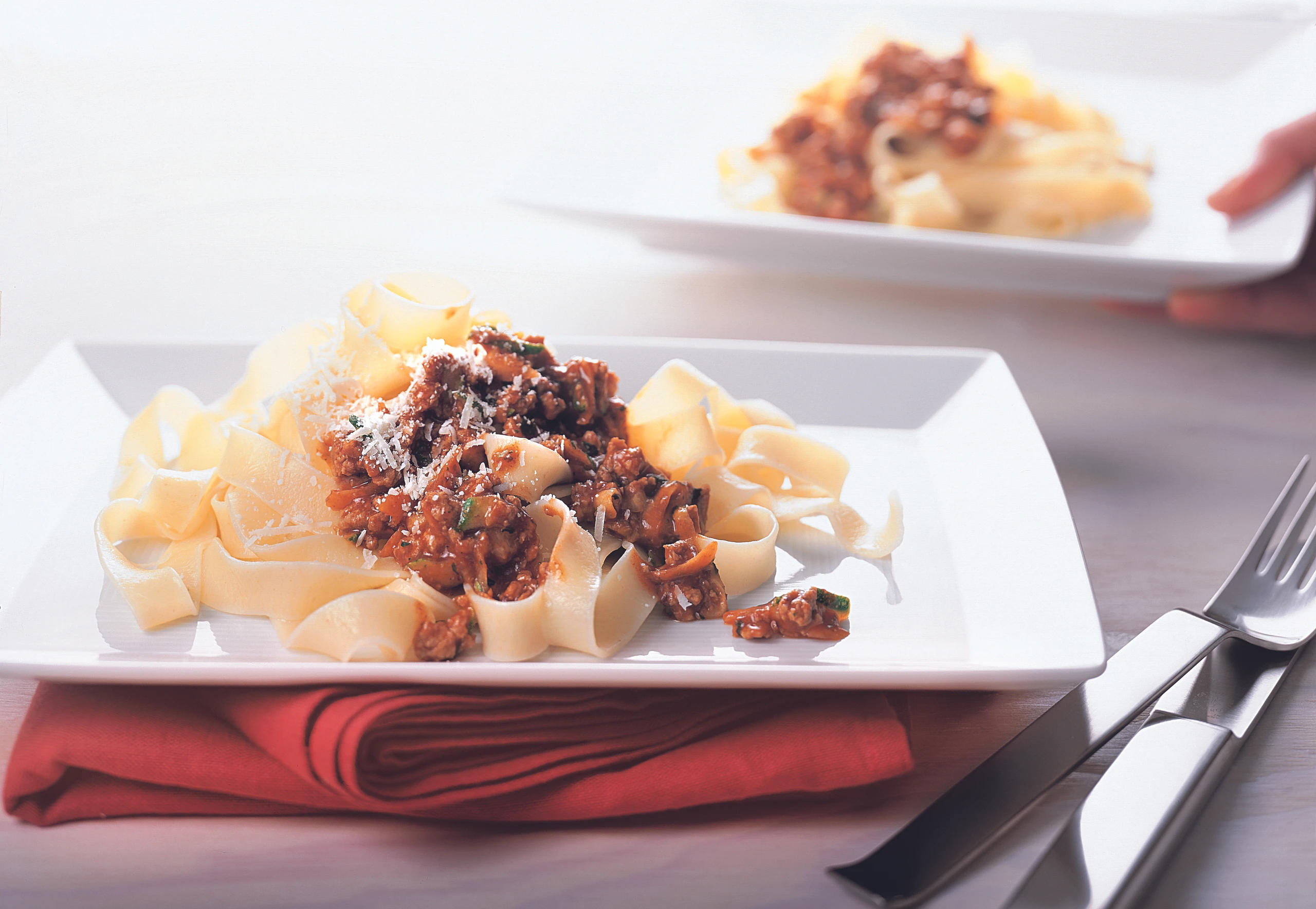 - Tagliatelle in Salzwasser bissfest kochen. Abseihen, abtropfen lassen, mit der Sauce anrichten und mit Parmesan bestreuen.