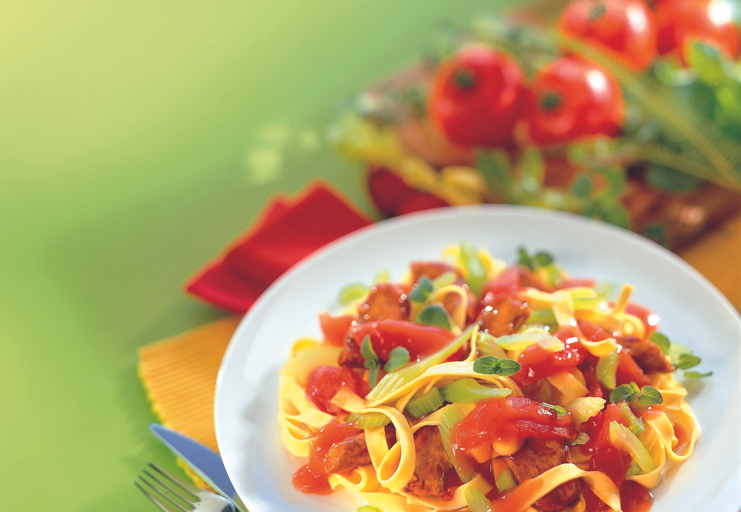 Pfanne säubern. Hühnerfleisch darin im restlichen Öl unter Rühren anbraten. Sellerie zugeben und kurz mitbraten. Paradeissauce zugießen, aufkochen und die Mischung ca. 1 Minuten bei schwacher Hitze köcheln. Mit Salz und Pfeffer würzen, Lorbeerblatt entfernen. Die heißen Nudeln mit der Fleisch-Sauce vermischen und anrichten.