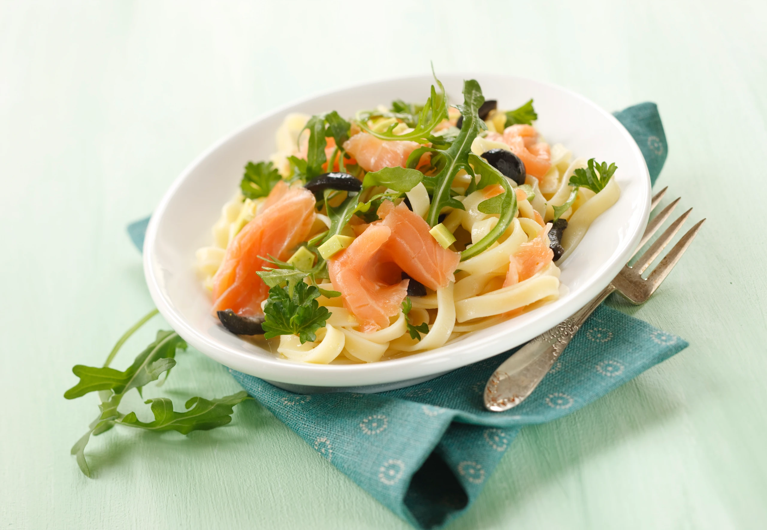 Tagliatelle in reichlich Salzwasser bissfest kochen, abseihen, abtropfen lassen und noch heiß mit der Suppe verrühren. Rucola, Oliven, Avocado und Lachs untermischen, mit Salz und Pfeffer würzen. Tagliatelle anrichten und mit Petersilie garniert servieren.