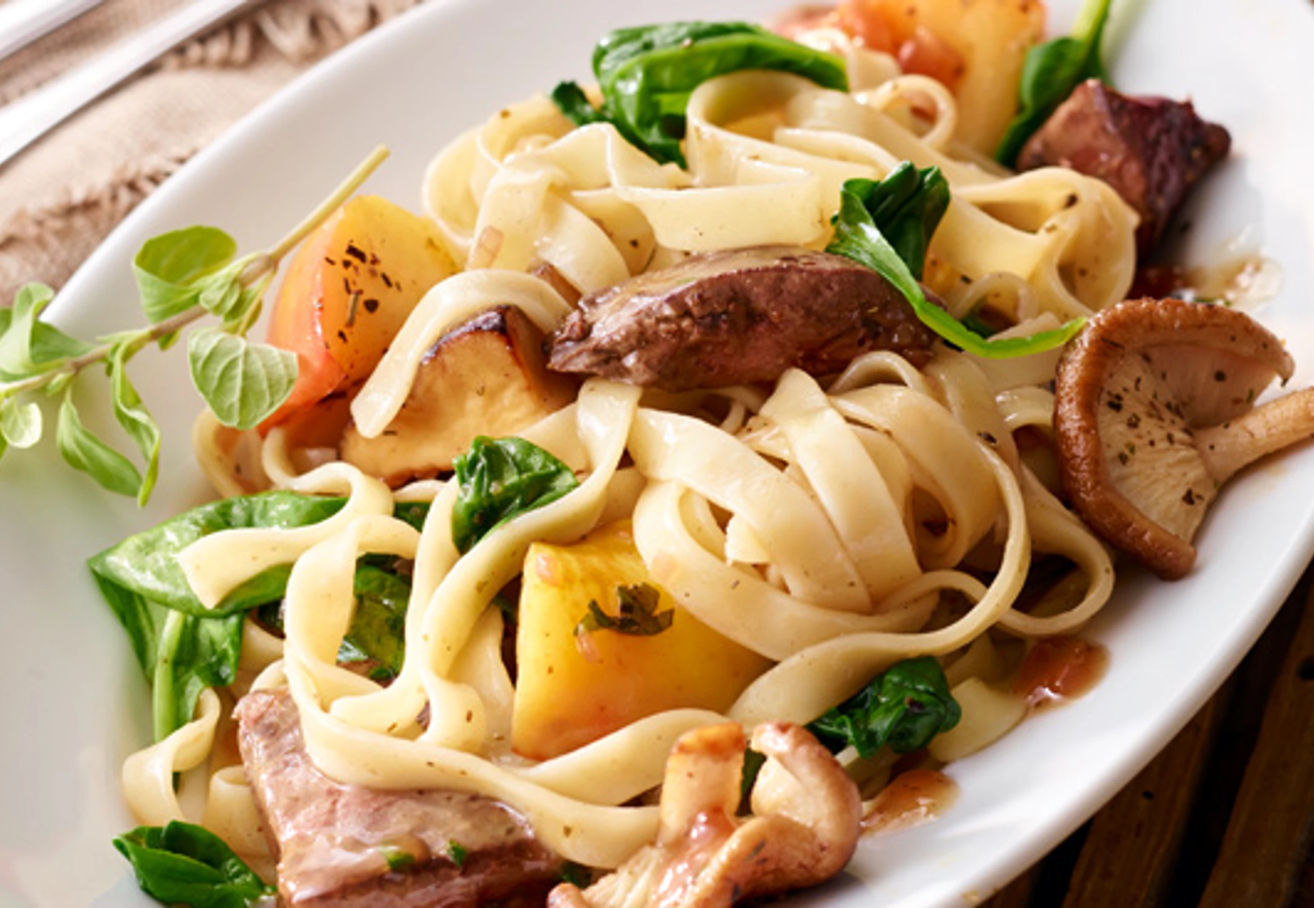 - Hühnerleber mit Salz und Pfeffer würzen. Leber, Pilze und Apfelstücke in 3 EL Öl rundum braten, mit Oregano würzen. Mischung auf einen Teller geben und im Rohr warm stellen.