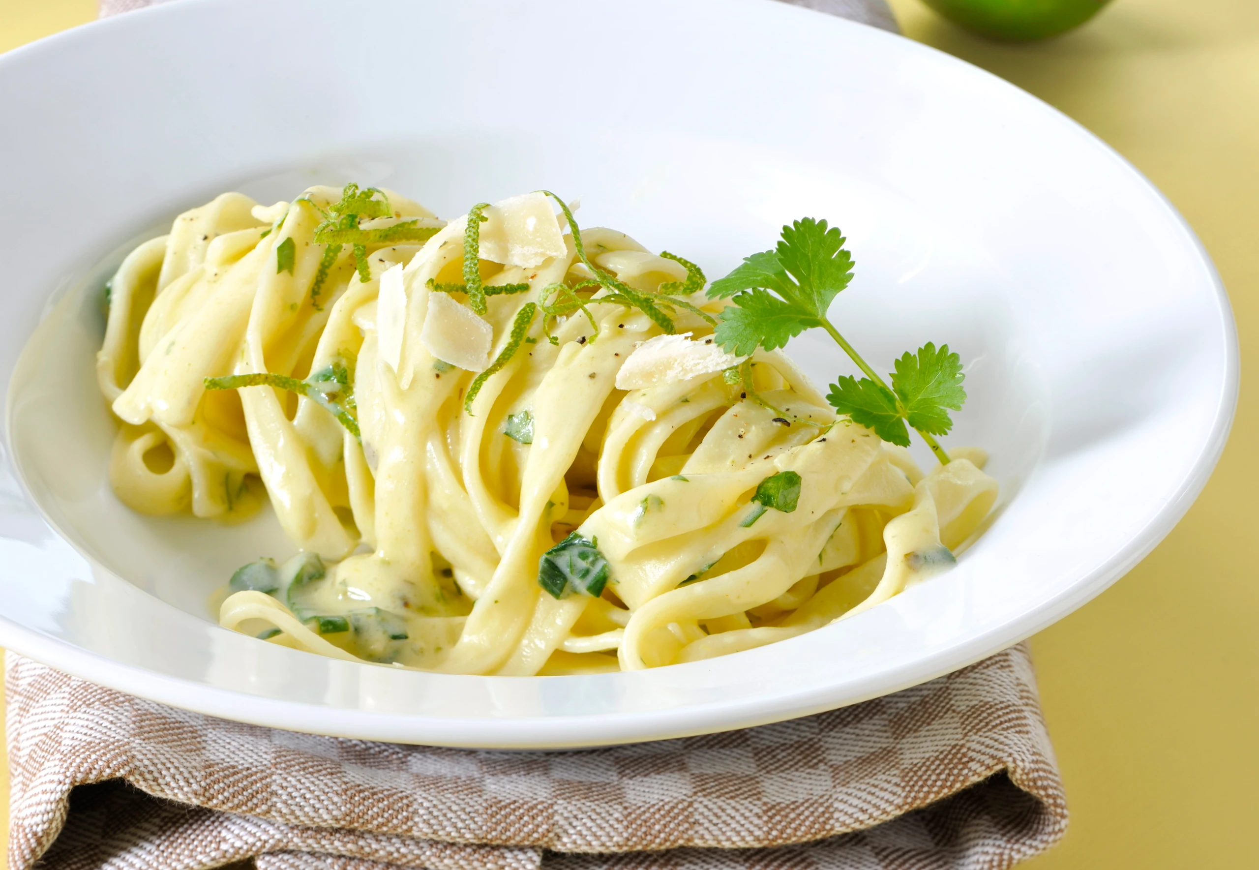 Jungzwiebeln putzen, quer in feine Scheiben schneiden und in Olivenöl anschwitzen. Mit Suppe ablöschen und mit Obers aufgießen. Sauce aufkochen. Stärke mit 2 TL Wasser verrühren. Wasabipaste, Limettensaft und Stärkemischung einrühren und die Sauce ein wenig einkochen lassen. Sauce mit Salz, Pfeffer und abgeriebener Limettenschale würzen. Koriander einrühren.
