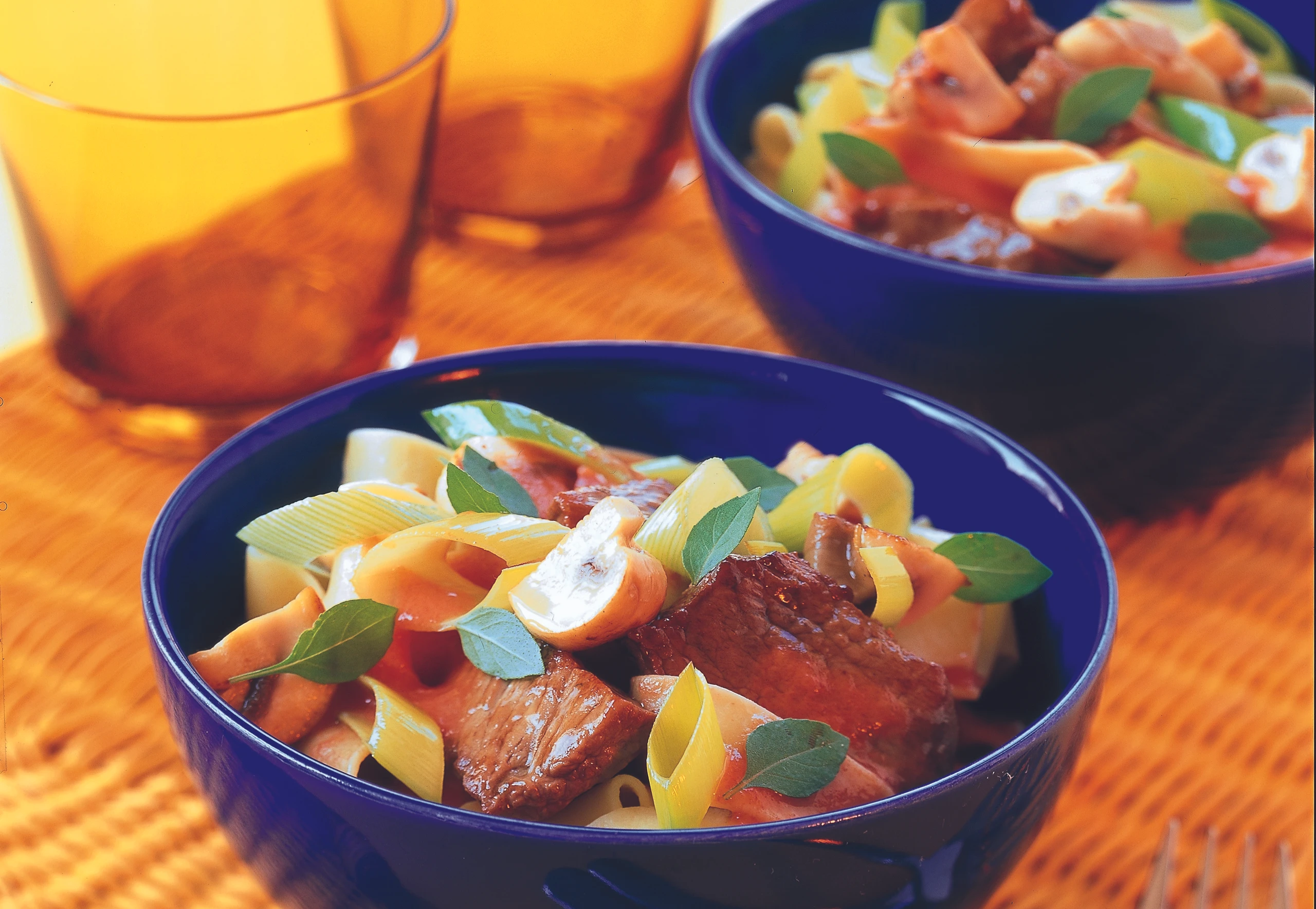 Im Wok übriges Öl erhitzen, Fleisch darin unter Rühren braten, salzen und pfeffern. Teigwaren abseihen, abtropfen lassen, mit Tomatensauce, Lauch, Pilzen, Fleisch und Basilikum vermischen und anrichten.