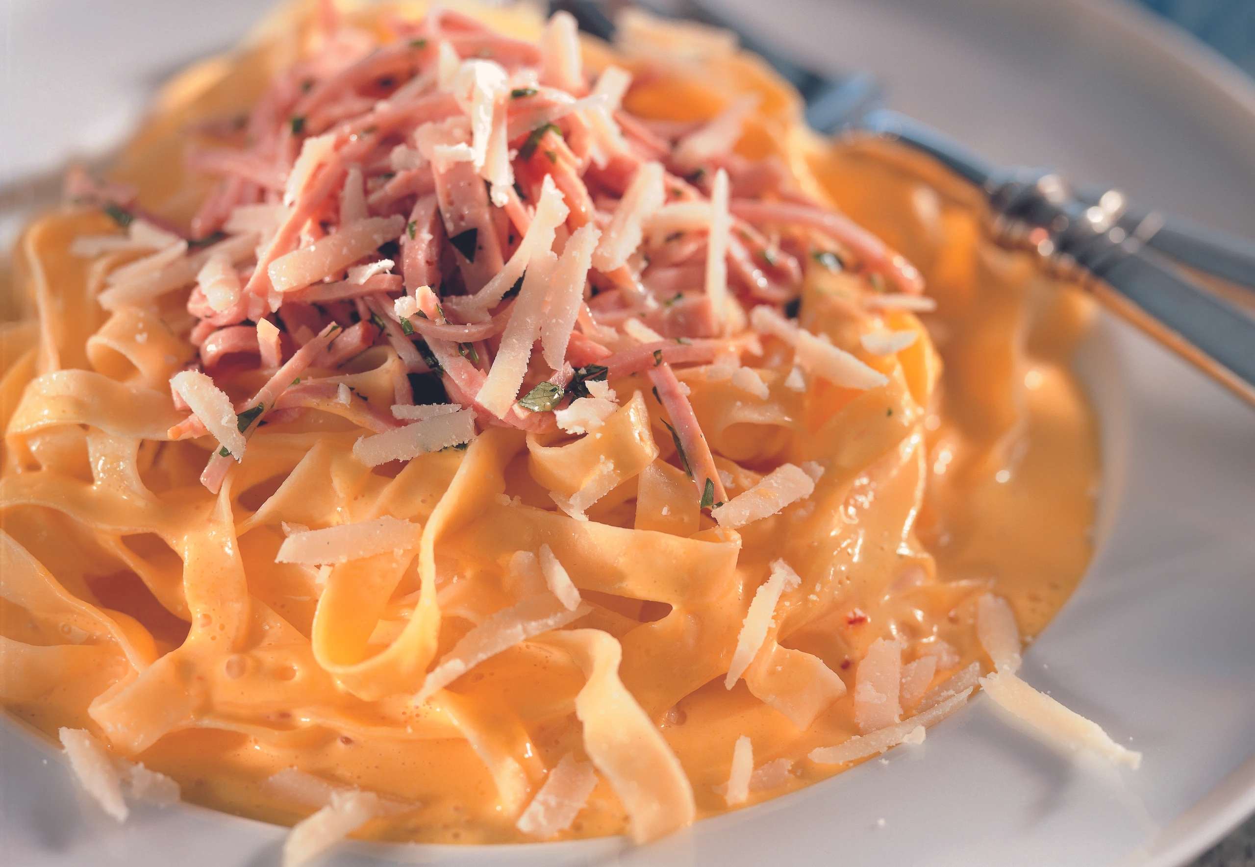 In einer großen Pfanne 50 g von der Butter aufschäumen, Schinken darin anbraten. Tagliatelle und übrige Butter zugeben und gut durchmischen.