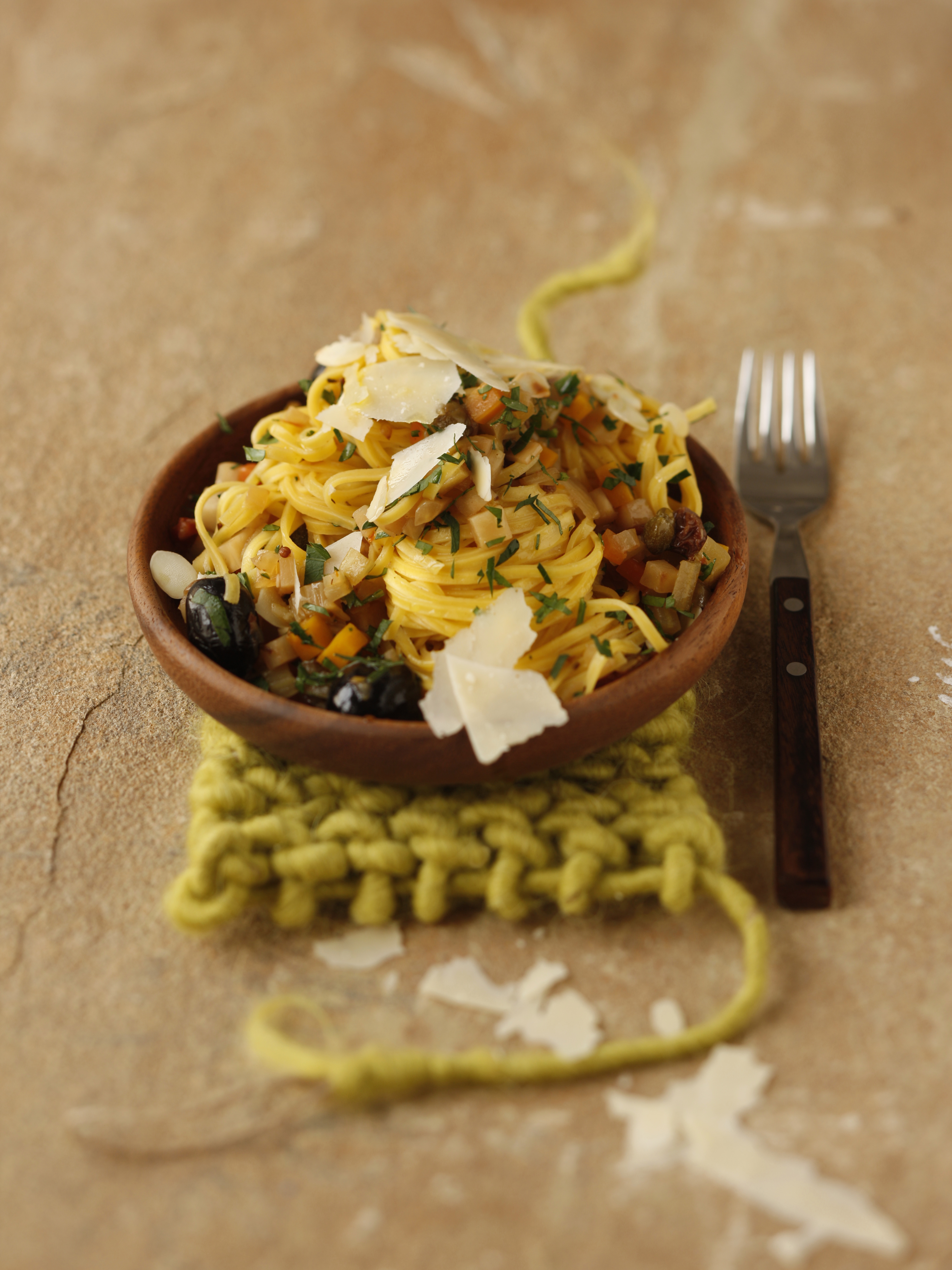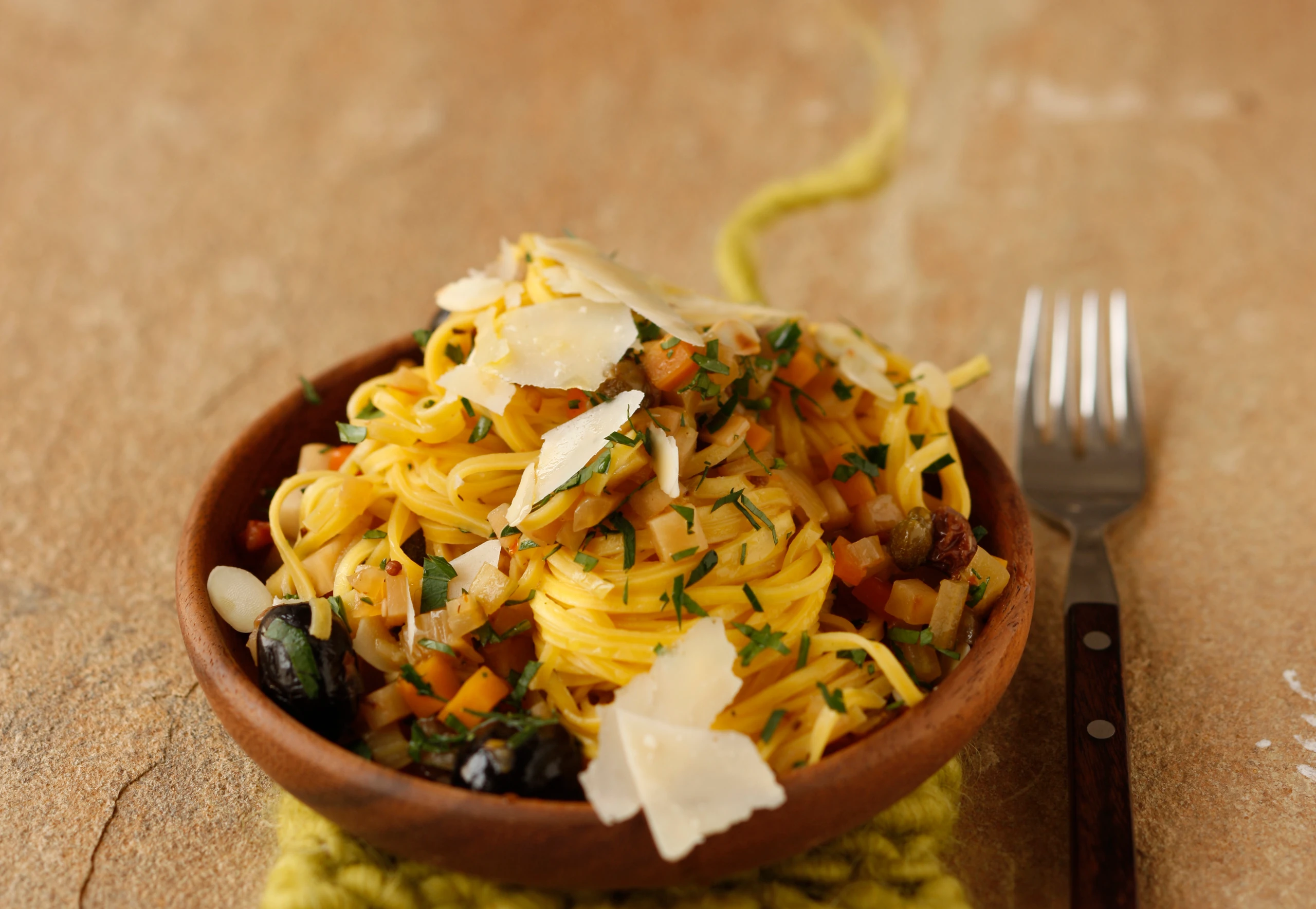 Tagliatelle in reichlich Salzwasser bissfest kochen. Petersilie fein schneiden und unter die Caponata mischen. Parmesan hobeln.