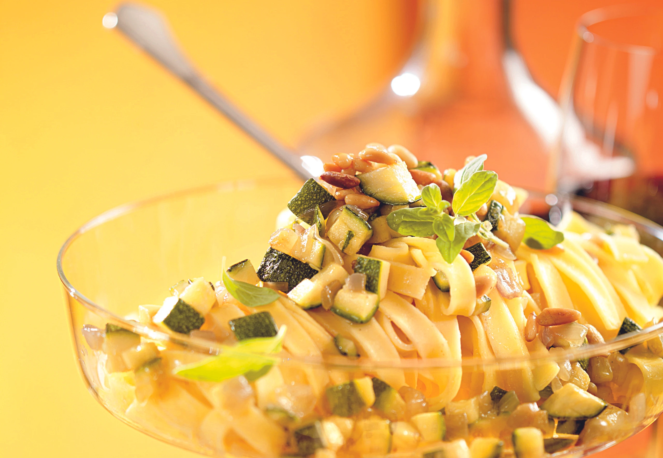 - In der Pfanne Öl erhitzen. Schalotten und Zucchini darin knackig rösten. Pignoli unterrühren, mit Salz und Pfeffer würzen.