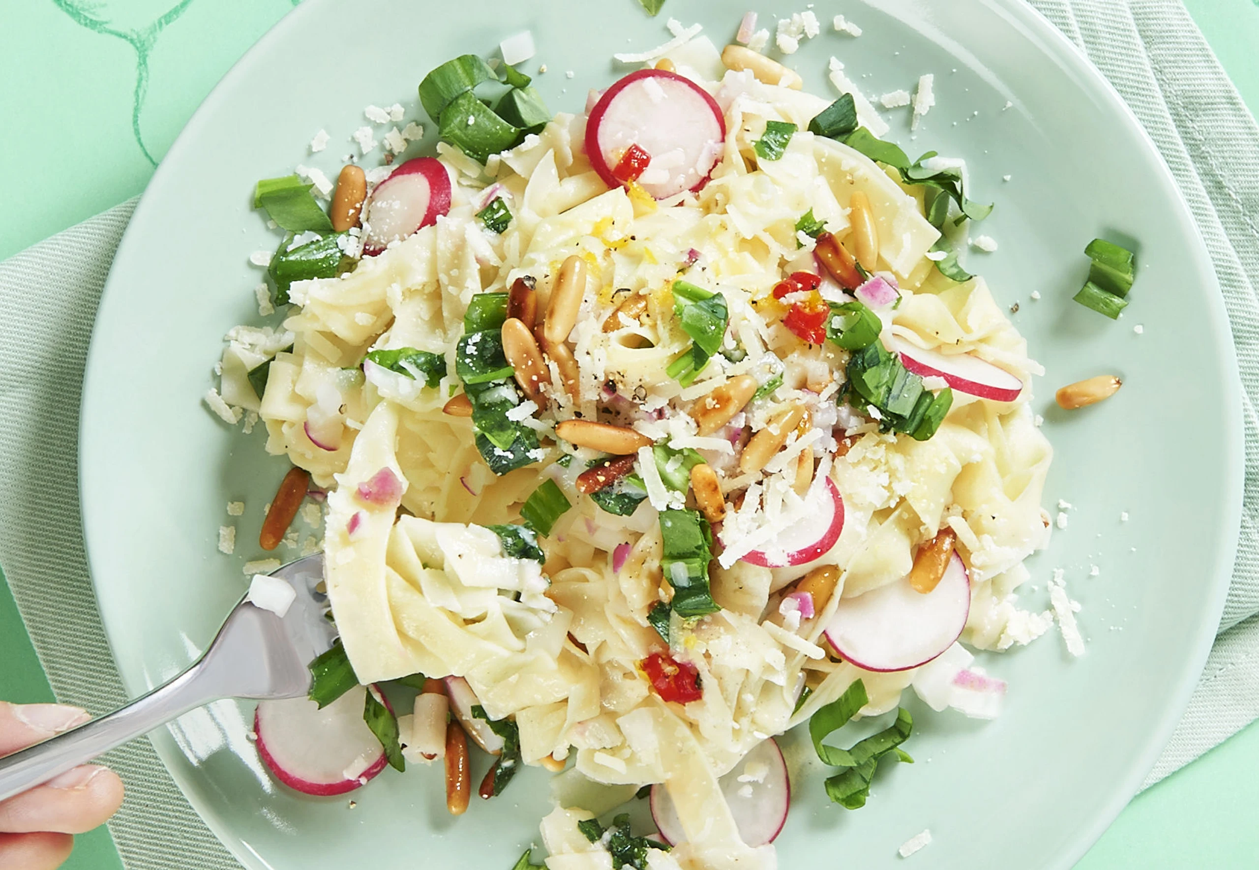 Tagliatelle in einer Pfanne mit Nudelwasser und Vinaigrette erwärmen und die Hälfte vom Parmesan zugeben. Pasta anrichten, mit restlichem Parmesan, Radieschenscheiben und Pignoli bestreut servieren.