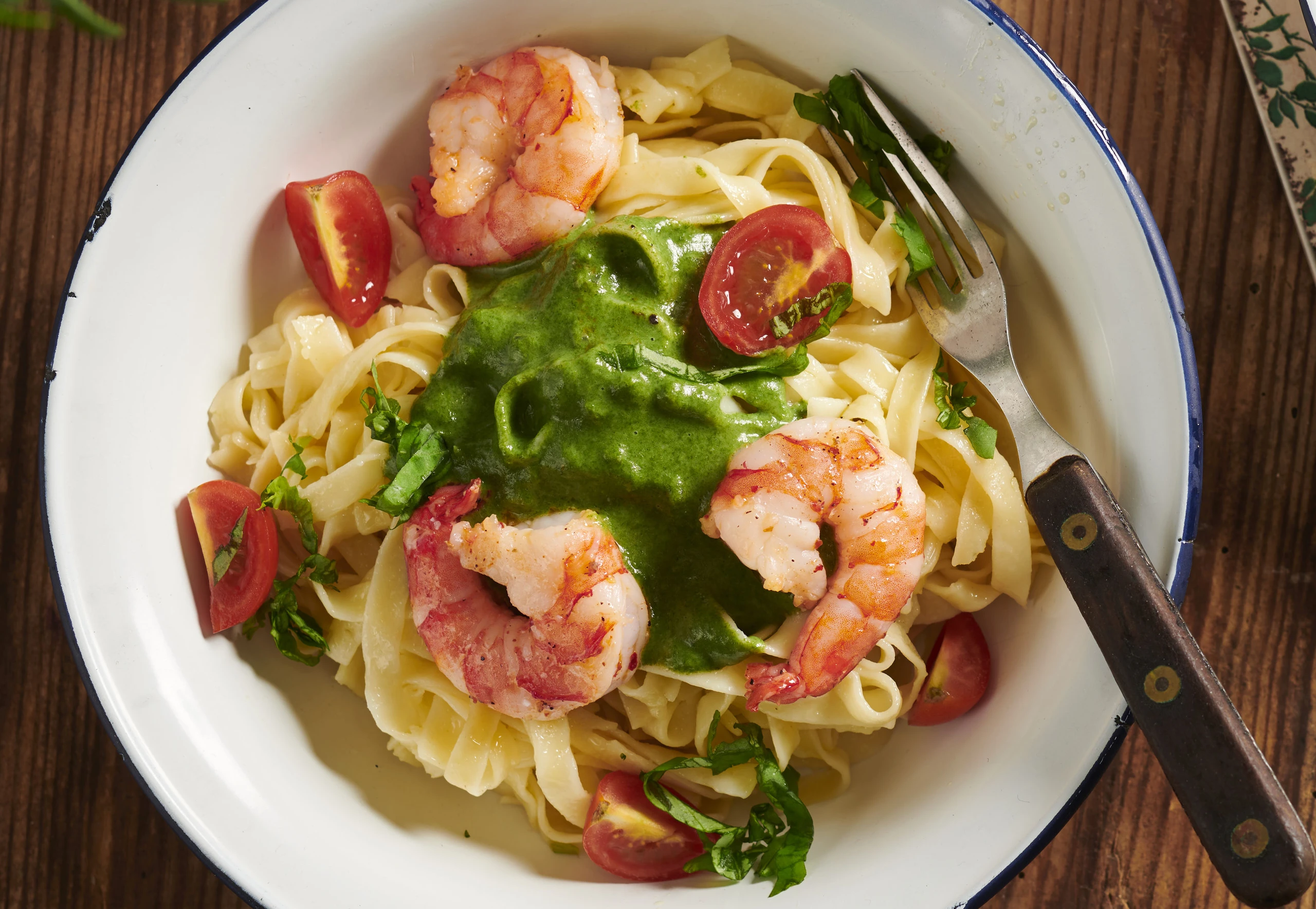 Pasta abseihen, mit der Sauce anrichten, Garnelen und Paradeiser darauf verteilen und mit Basilikum bestreuen.