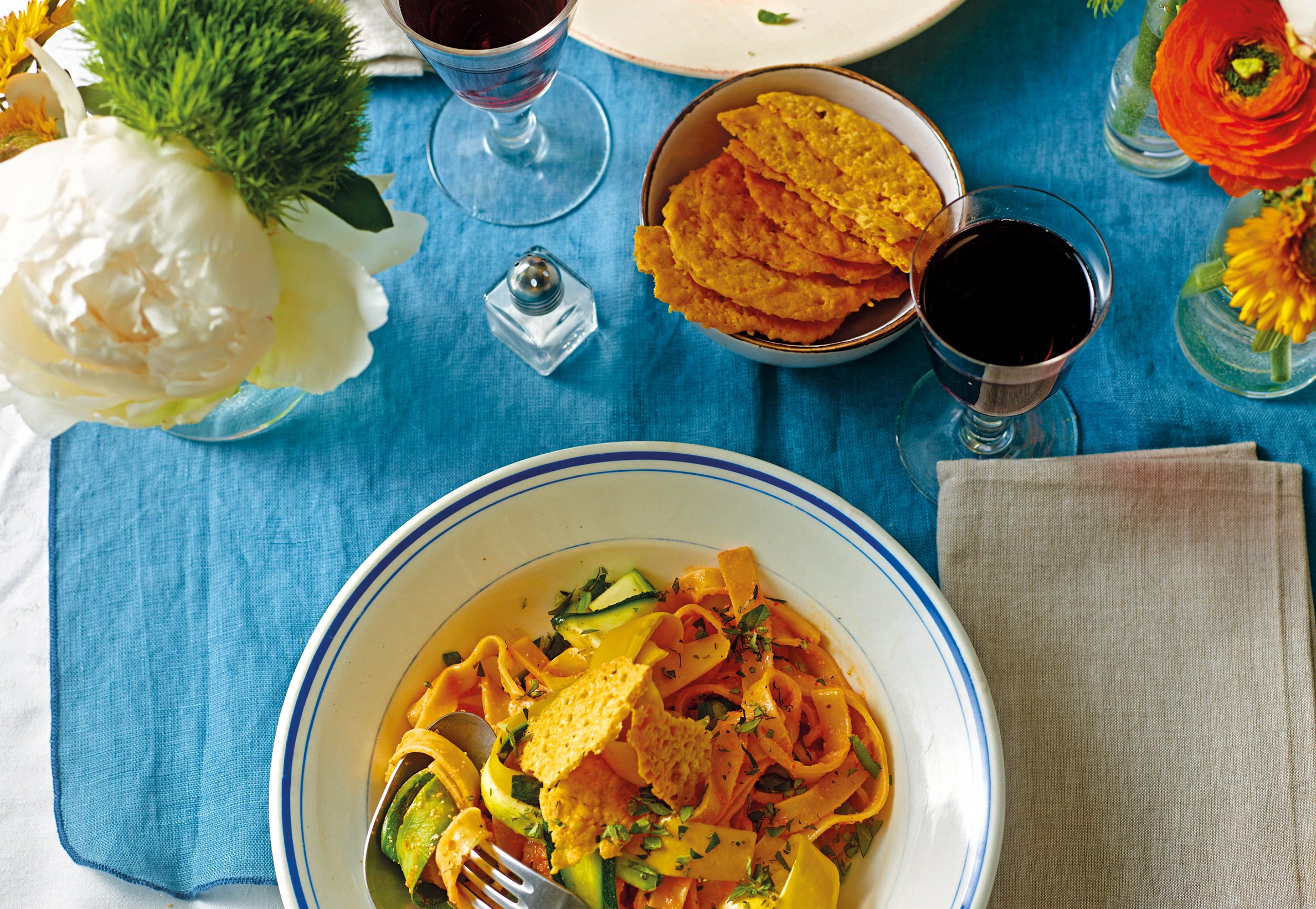 Tagliatelle mit Zucchini und Paprika-Erdnusssauce