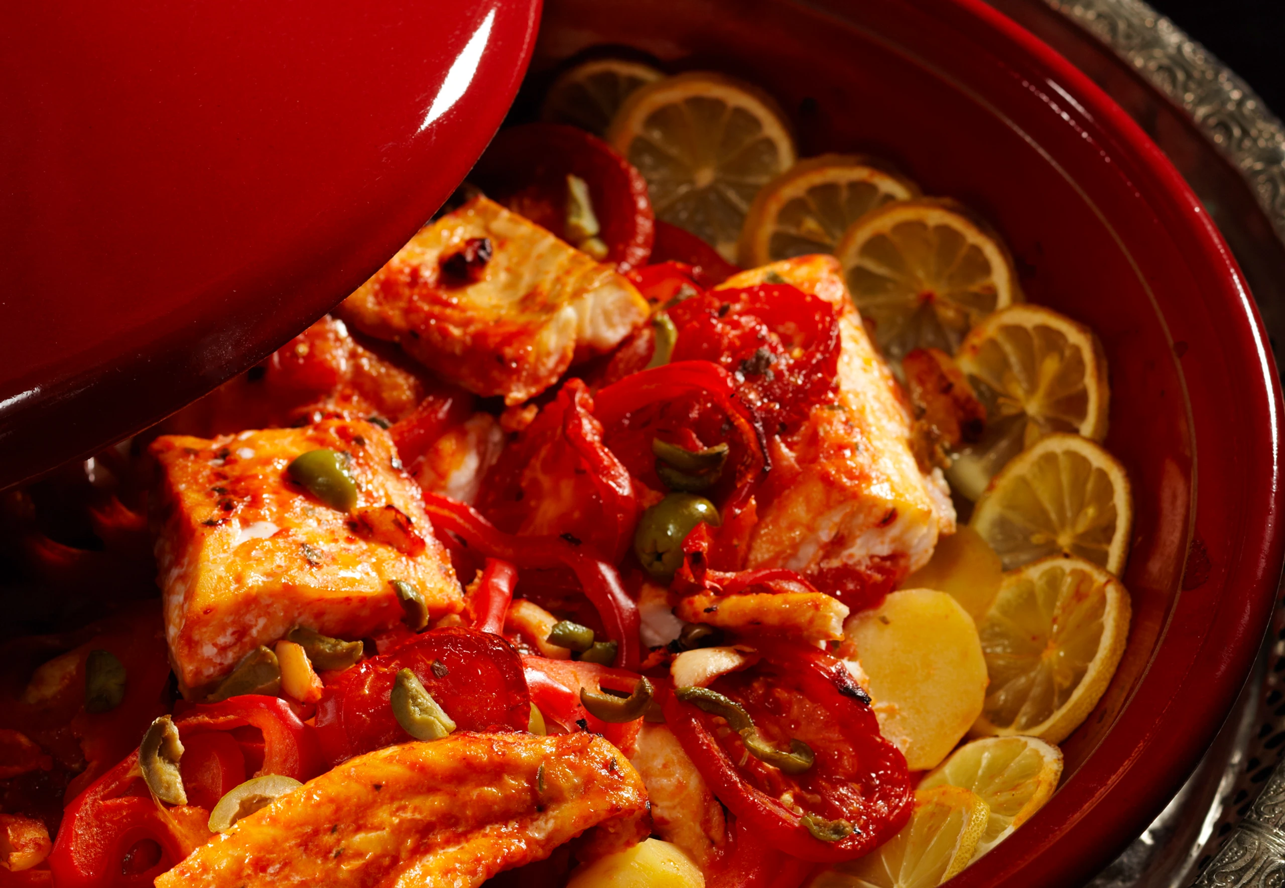 - Erdäpfelscheiben in die Tajine legen. Rand der Tajine mit Zitronenscheiben auslegen. Paradeiser und marinierten Hammour schichtweise einlegen. Marinade darauf verteilen, mit Paprika und Oliven belegen. Tajine auf dem Herd bei schwacher Hitze ca. 20 Minuten garen.