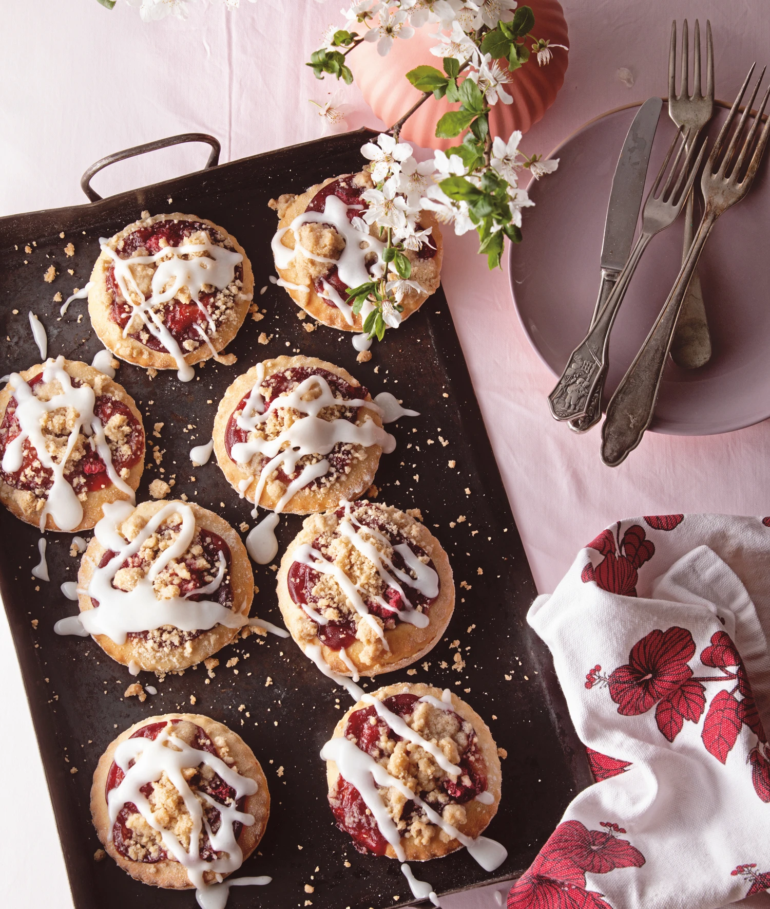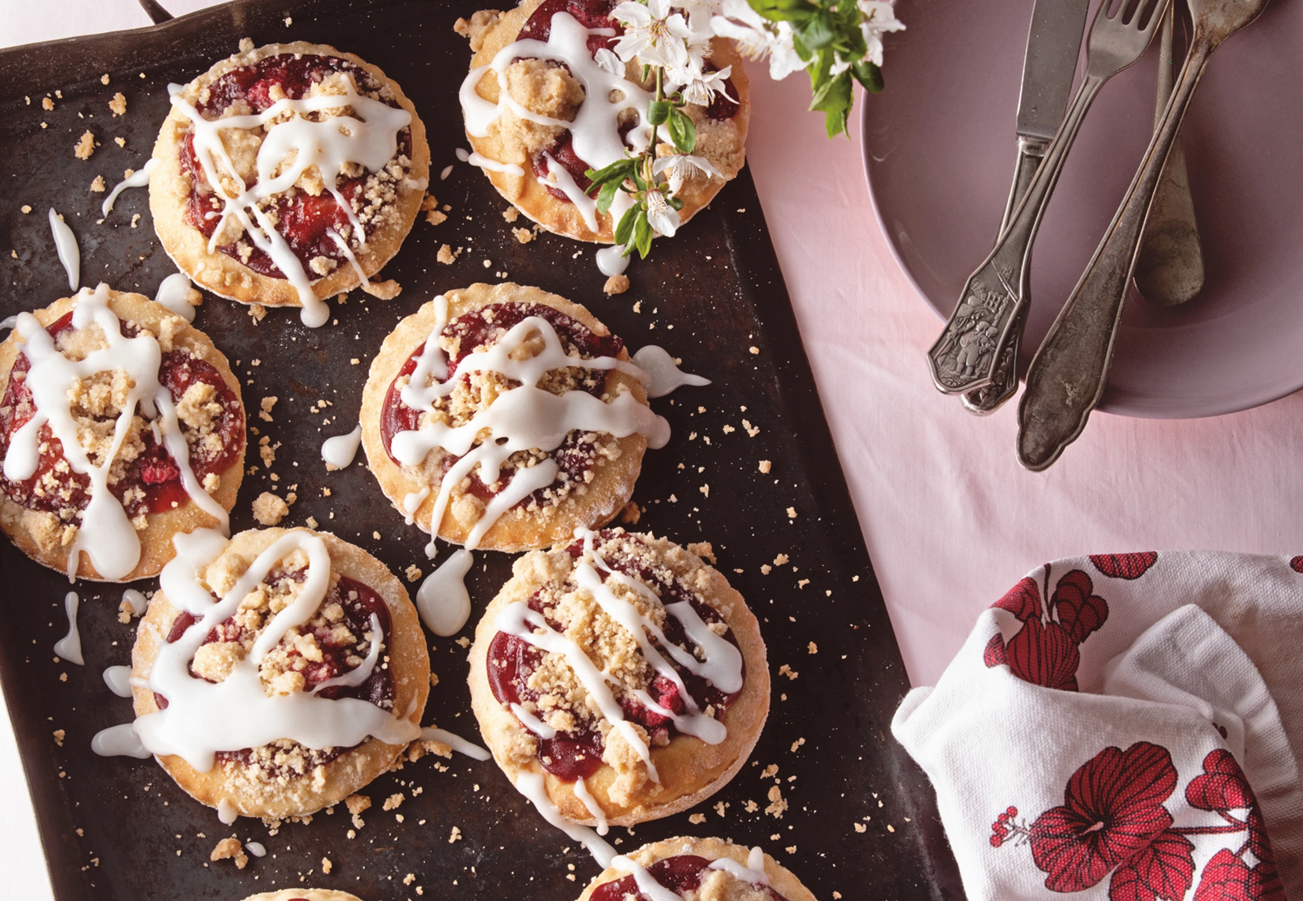 Teig auf einer leicht bemehlten Arbeitsfläche ausrollen und 12 Scheiben (Ø 10 cm) ausstechen. Scheiben auf das Blech legen und mit Marmelade bestreichen. Streusel darauf verteilen. Taler im Rohr (mittlere Schiene) ca. 15 Minuten backen. Herausnehmen und überkühlen lassen.