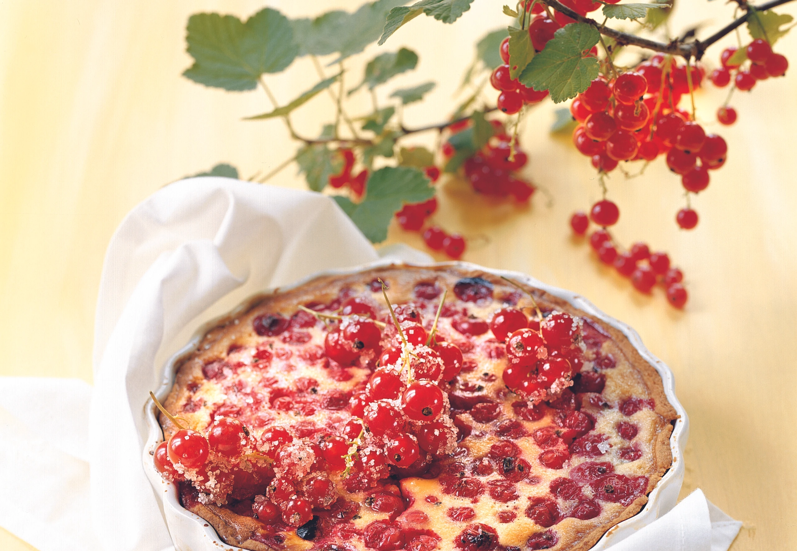 Für die Garnitur Ribiselrispen im Zucker wenden, Tarte damit garnieren.