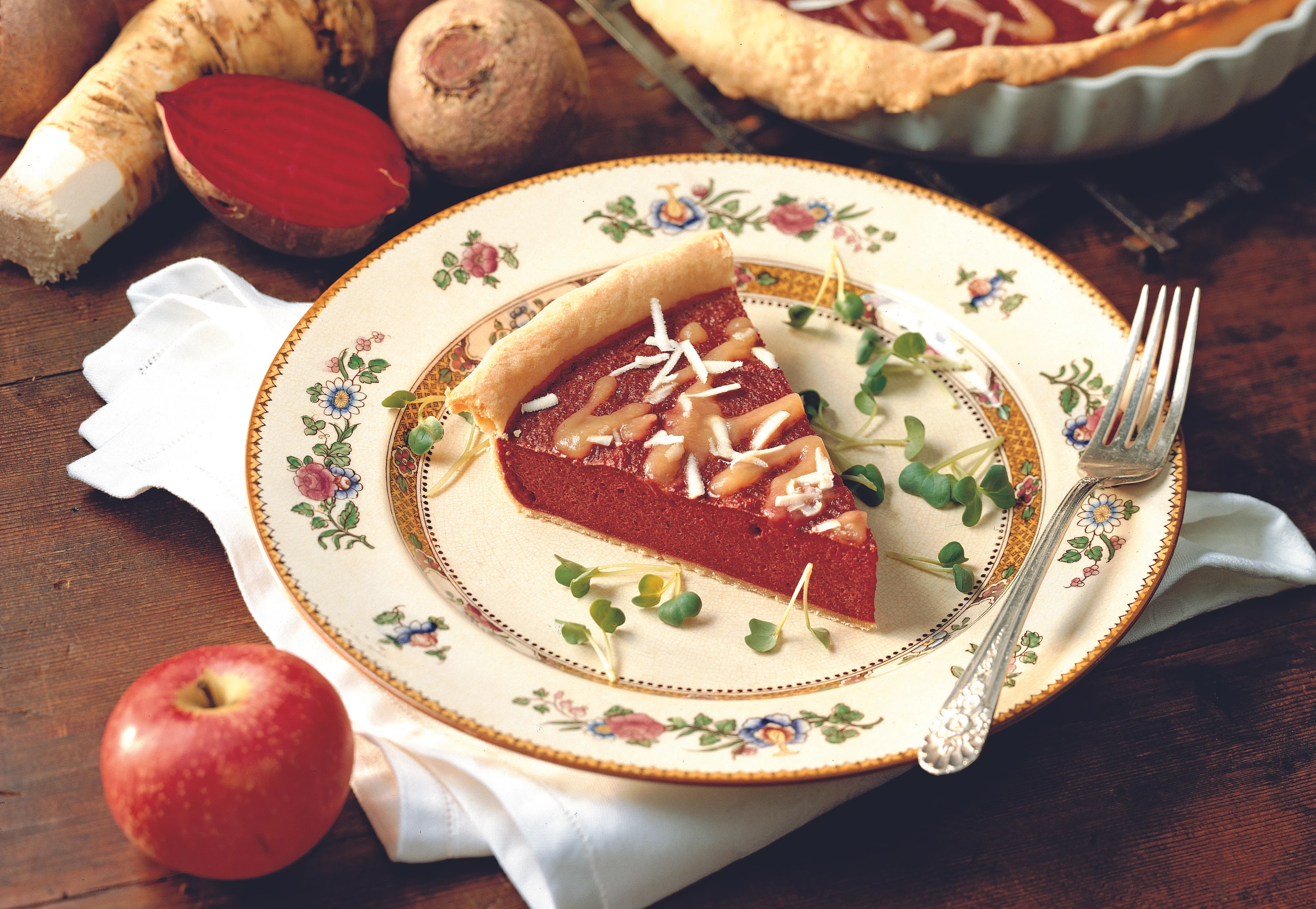 Backrohr auf 180 °C vorheizen. Teig auf einer leicht bemehlten Arbeitsfläche ca. 1/2 cm dick ausrollen. Eine Tarteform (Ø 26 cm) so damit auslegen, daß der Teig ca. 1 cm über den Rand der Form ragt. Teigboden mehrmals mit einer Gabel einstechen. Fülle in die Form gießen und gleichmäßig verstreichen.