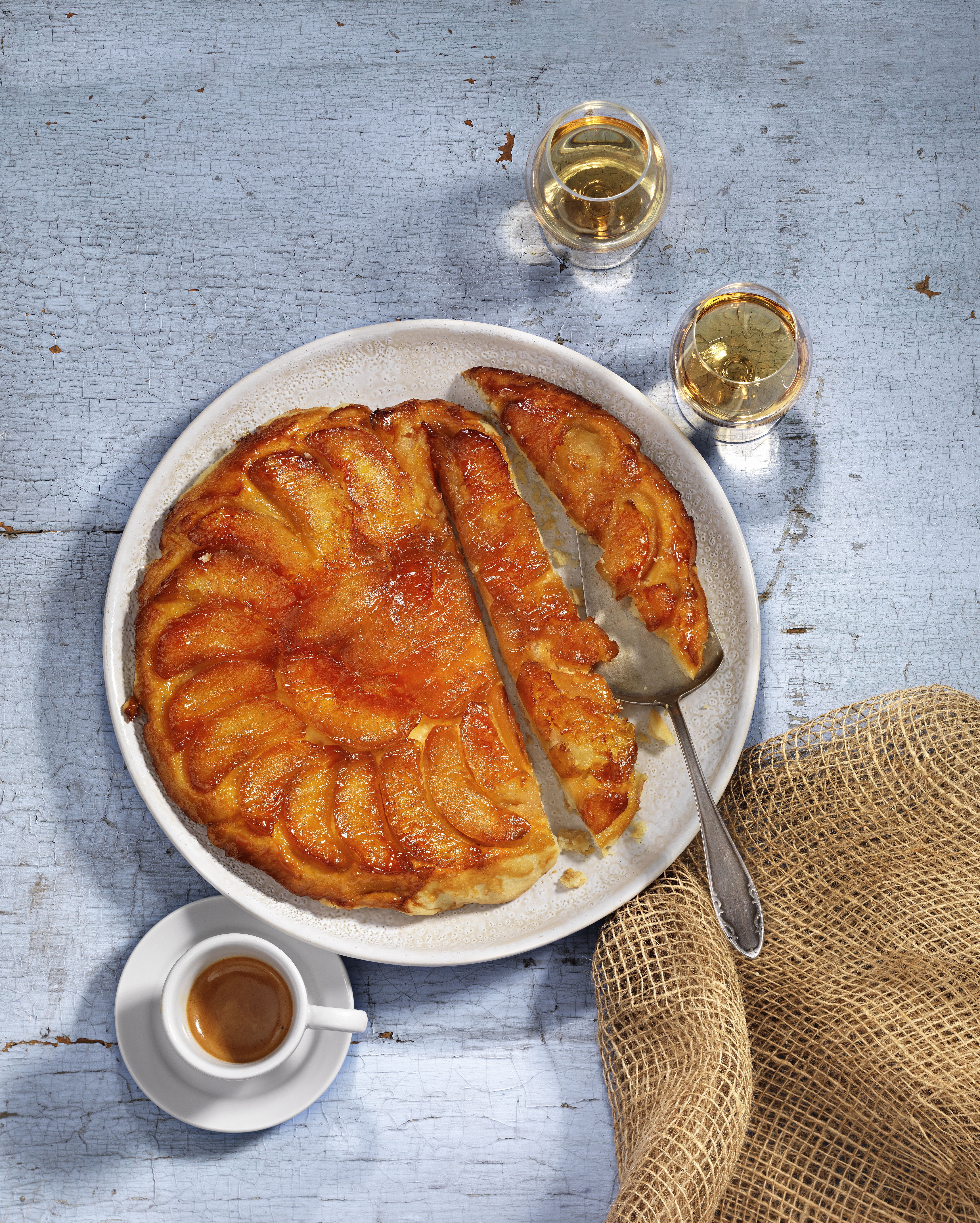 Äpfel schälen, Kerngehäuse ausstechen, Äpfel in breite Spalten schneiden. Backzucker in eine Pfanne (Ø ca. 25 cm) streuen, 50 g Butter darauf verteilen, Masse langsam erhitzen. Äpfel darauf verteilen und unter öfterem Wenden karamellisieren lassen. Wenn sie braun sind, fächerartig verteilen.