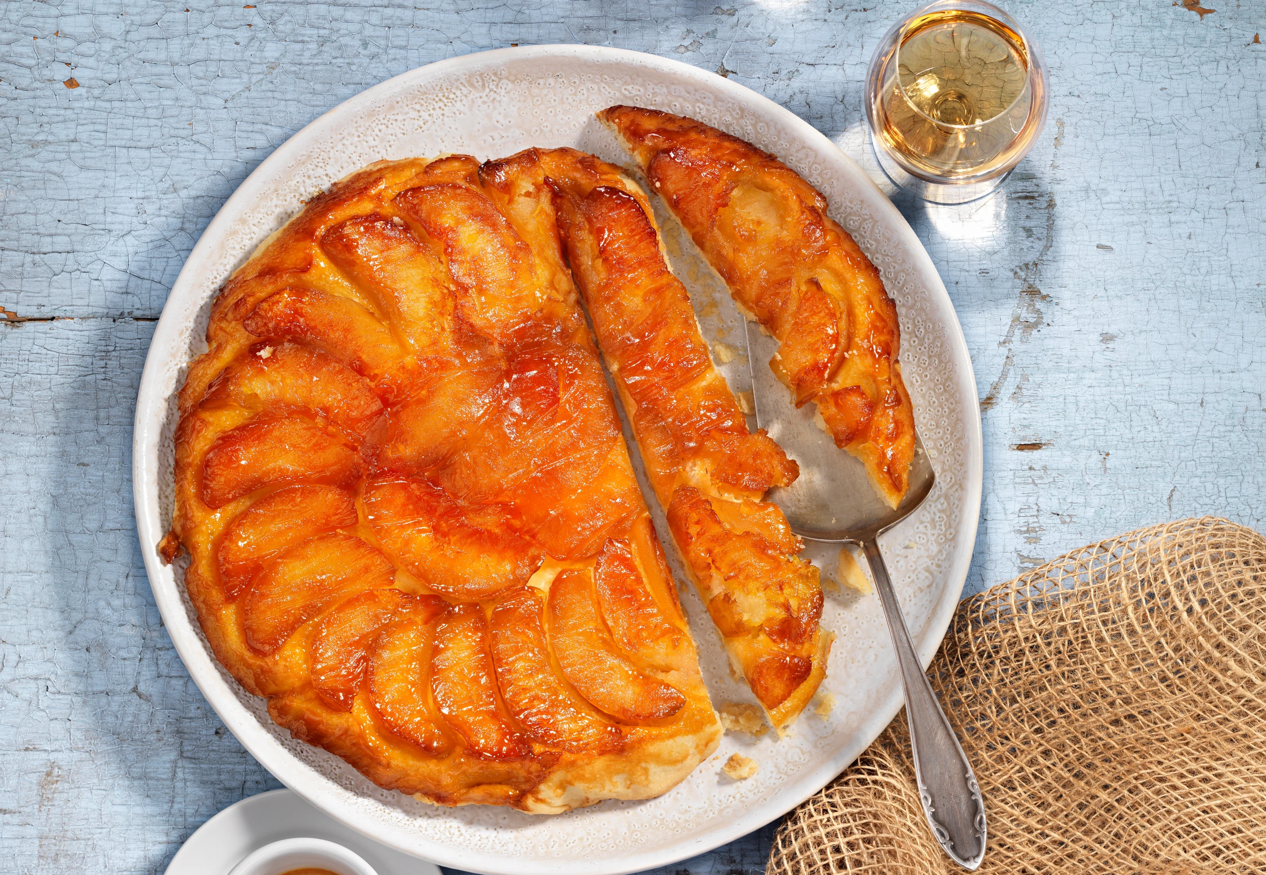 Rohr auf 200°C vorheizen. Teig dünn ausrollen (Ø 30 cm) und über die Äpfel legen, Ränder nach unten drücken.