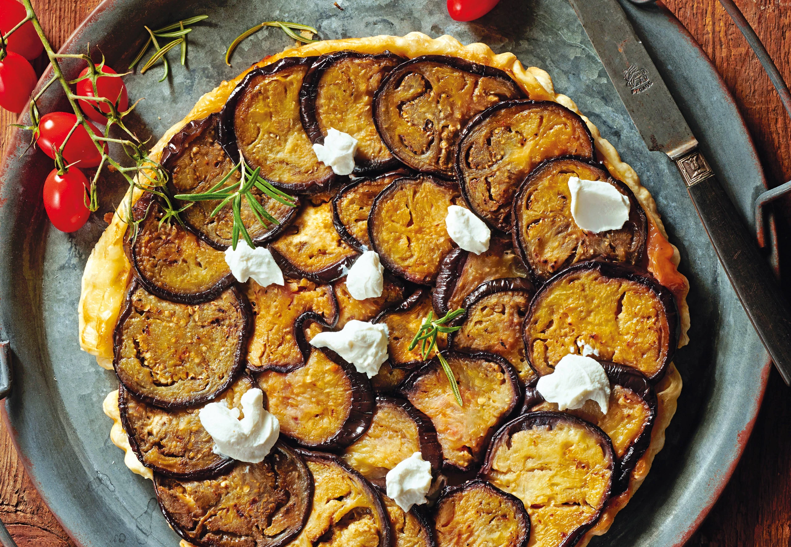 Rohr auf 180°C vorheizen. Tarteform (Ø 28–32 cm) mit Öl einpinseln. Den Boden der Form mit Melanzanischeiben belegen. 2 EL vom Frischkäse für die Garnitur beiseite stellen. Paradeiser und übrigen Frischkäse auf den Melanzanischeiben verteilen. Teig darauf legen und den überstehenden Rand einschlagen.
