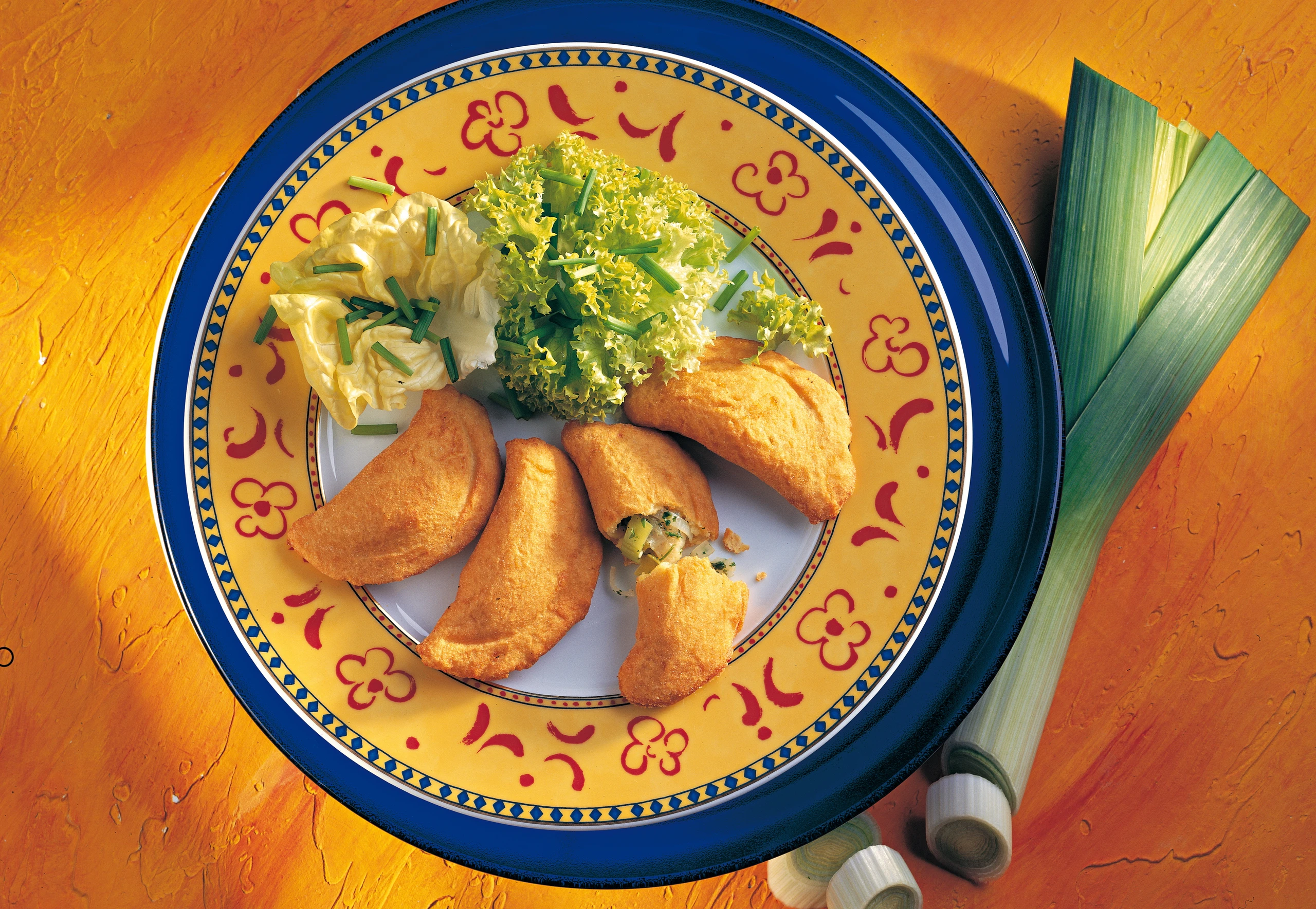 Erdäpfeltascherl mit Lauch-Käse-Fülle