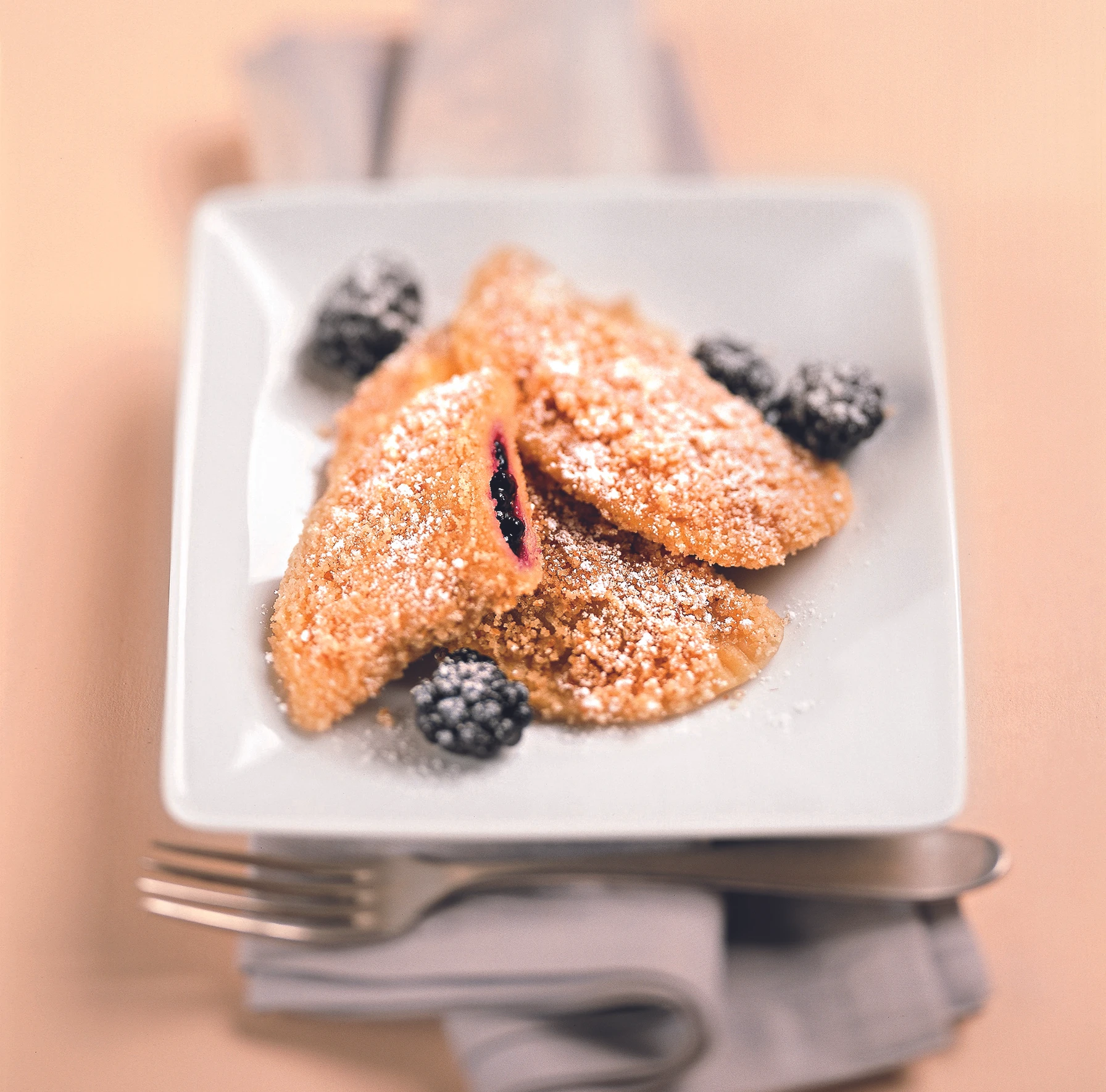 Während die Tascherln kochen, Butter schmelzen, Brösel und Zucker zugeben und unter Rühren rösten. Tascherln in den Bröseln wälzen und mit Brombeeren garniert servieren.