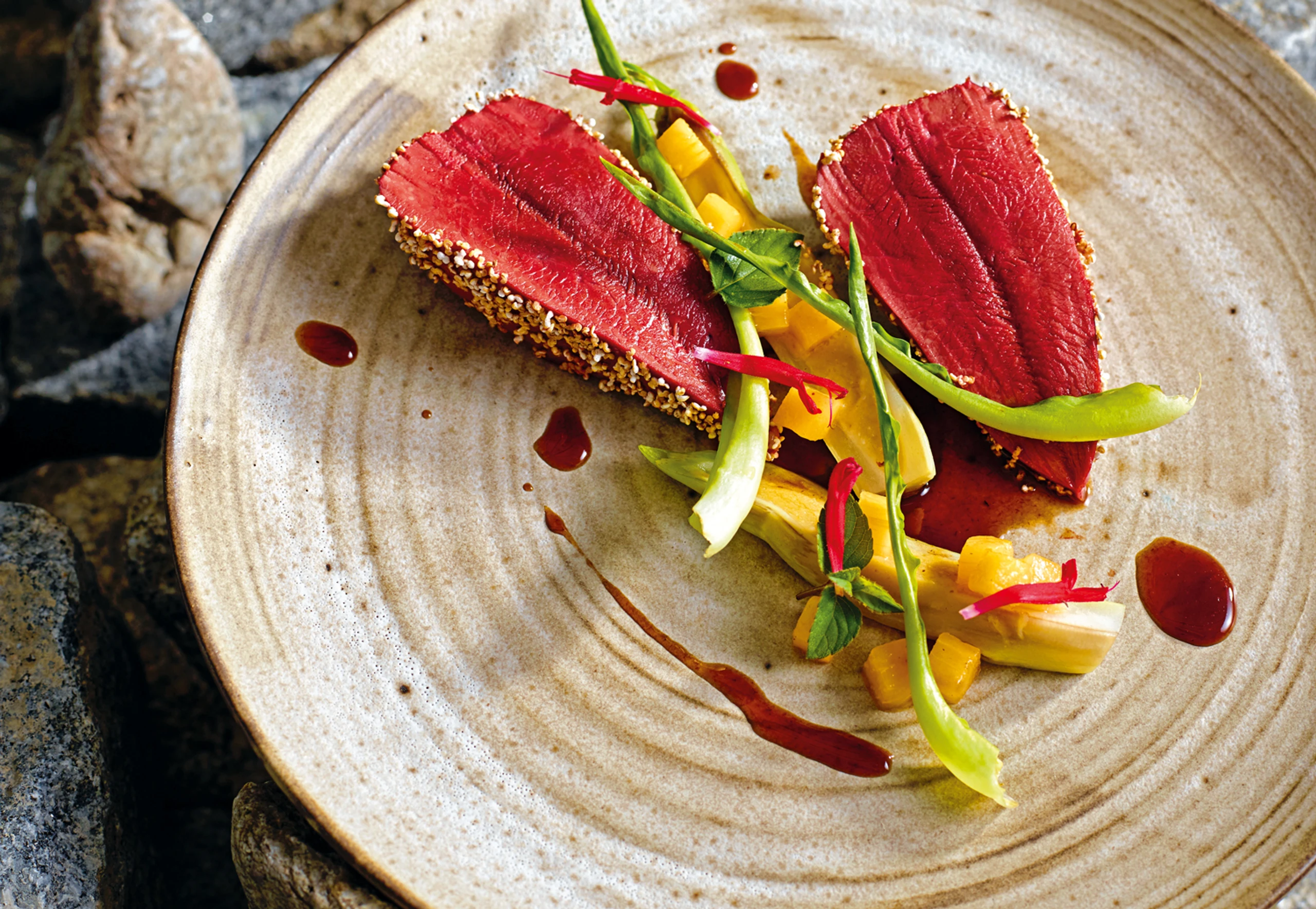 Brustfilets beidseitig vom Brustbein schneiden und mit der Außenseite in den Amarant drücken. Brüstchen mit der Schnittfläche nach oben anrichten und mit Sauce, gefüllten und übrigen Puntarellastängeln, Sharonfrucht und Ananassalbei garniert servieren.