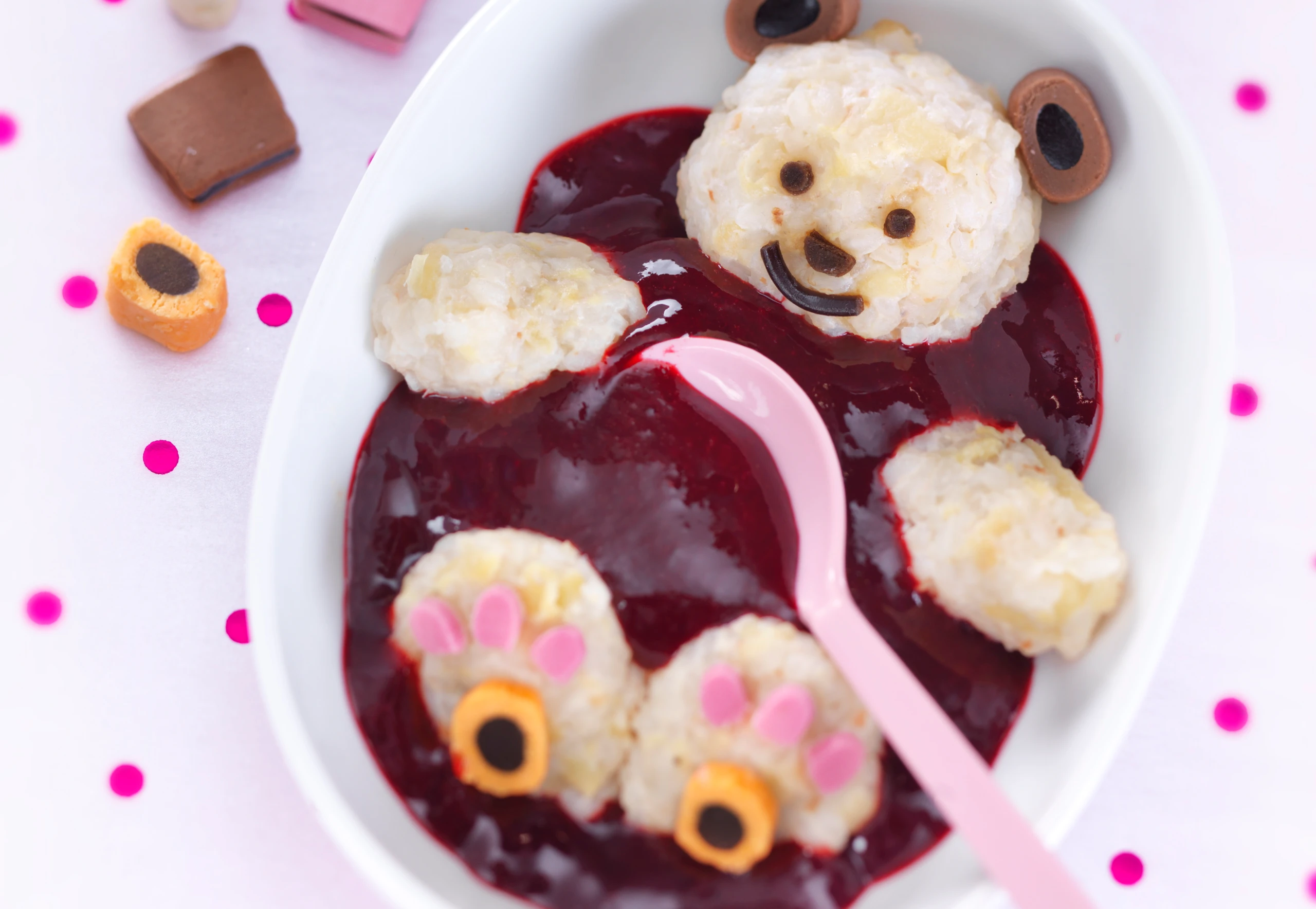 Milchreis zu Kopf, Armen und Beinen des Bären formen und in einer Schüssel anrichten.