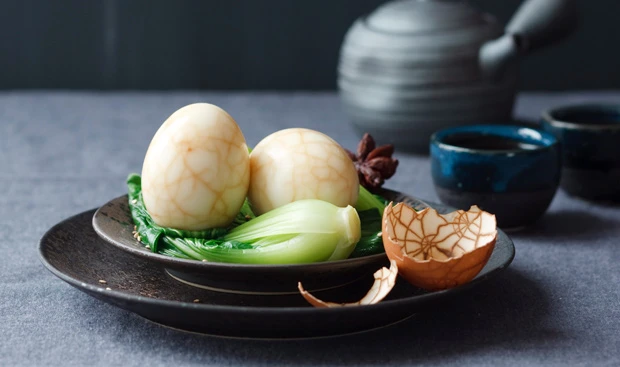 - Ca. 100 ml vom Teesud mit der Sojasauce verrühren und auf die Hälfte einkochen. Eier aus dem Sud nehmen und schälen.