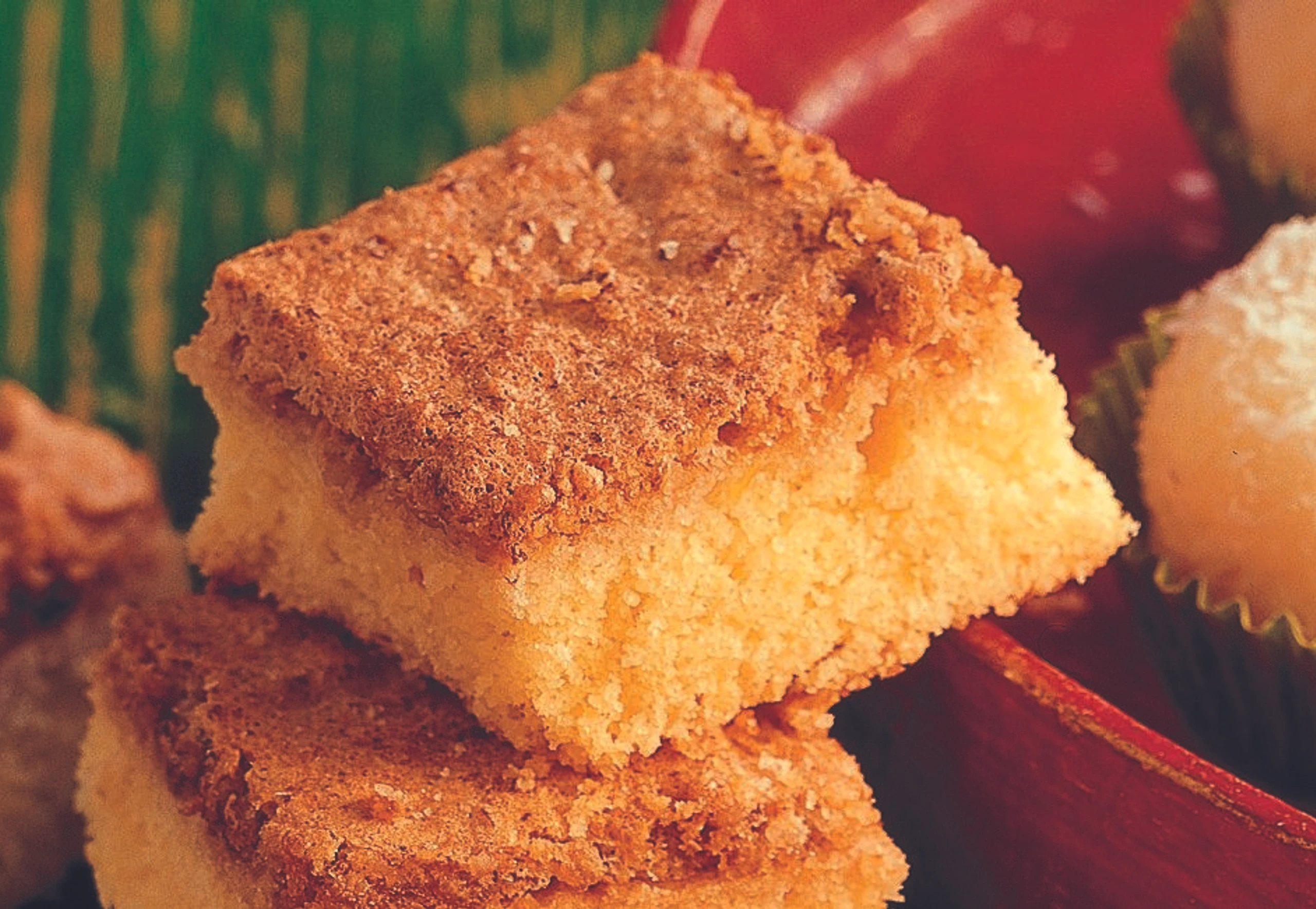 Kuchen aus dem Rohr nehmen, kurz abkühlen lassen und noch warm in 3 cm große Schnitten schneiden.