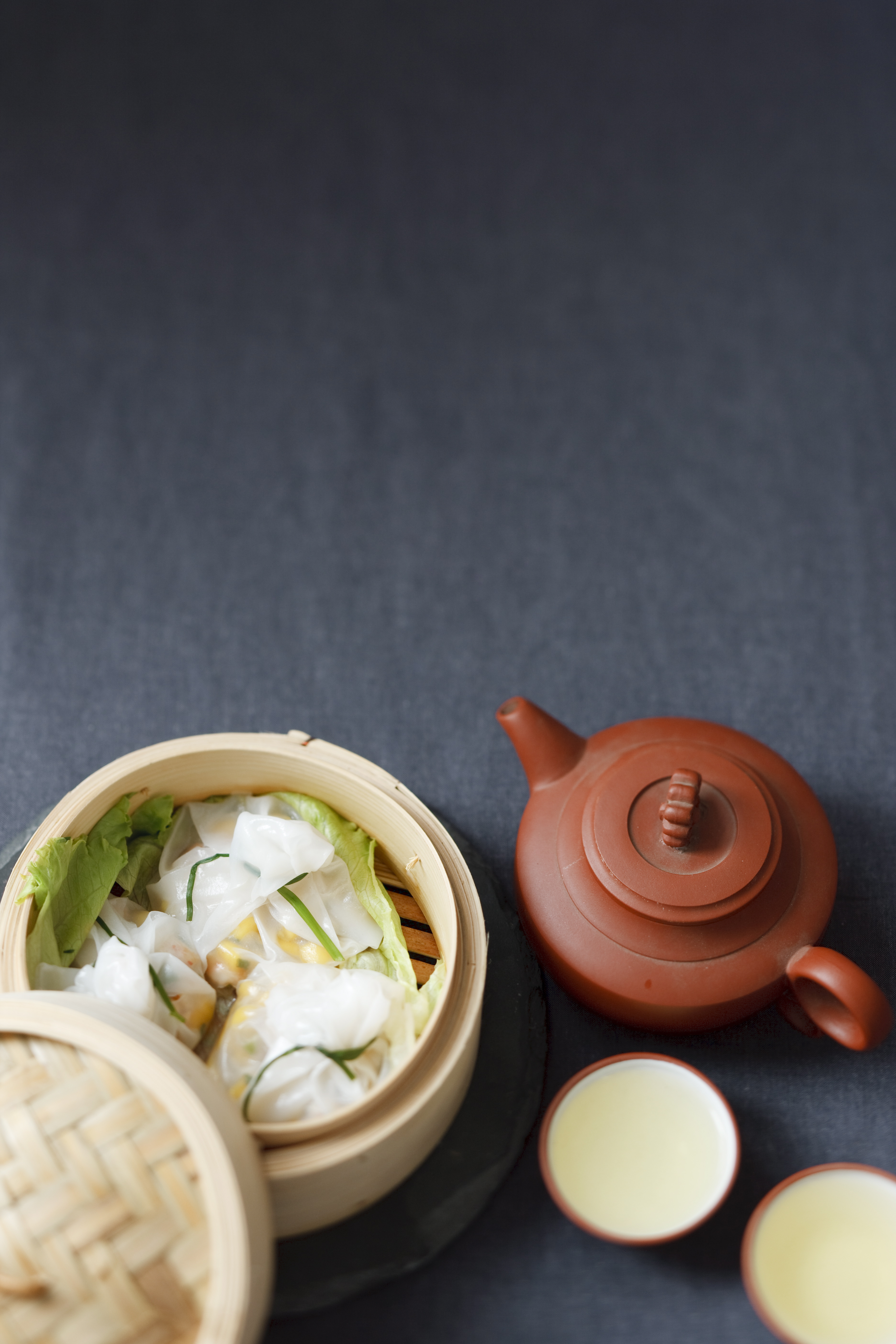 In einem Topf Wasser aufkochen, einen Siebeinsatz oder ein Bambuskörbchen darüber geben und mit Salatblättern auslegen. Teigtaschen darauf setzen und in mehreren Arbeitsgängen zugedeckt bei großer Hitze ca. 15 Minuten dämpfen.